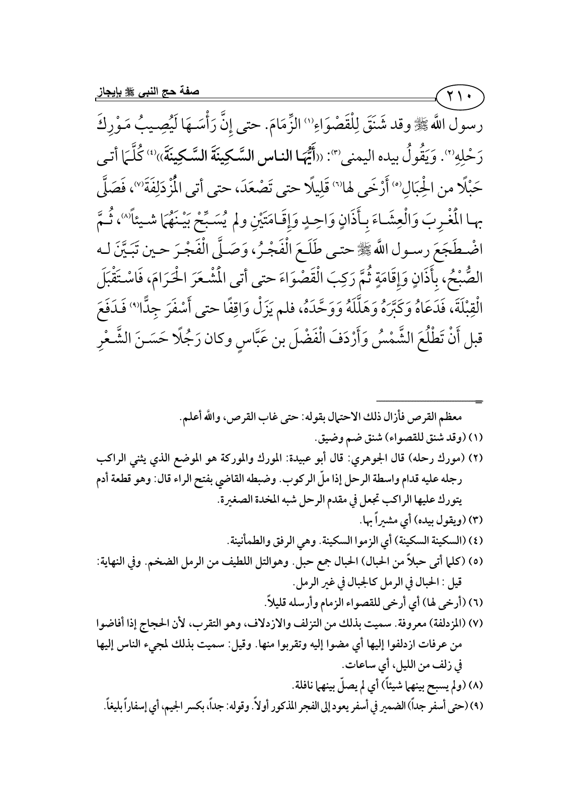 رسول اللَّه - صلى الله عليه وسلم - وقد شَنَقَ لِلْقَصْوَاءِ (¬1) الزِّمَامَ. حتى إِنَّ رَأْسَهَا لَيُصِيبُ مَوْرِكَ رَحْلِهِ (¬2). وَيَقُولُ بيده اليمنى (¬3): ((أَيُّهَا الناس السَّكِينَةَ السَّكِينَةَ)) (¬4) كُلَّمَا أتى حَبْلًا من الْحِبَالِ (¬5) أَرْخَى لها (¬6) قَلِيلًا حتى تَصْعَدَ، حتى أتى الْمُزْدَلِفَةَ (¬7)، فَصَلَّى بها الْمَغْرِبَ وَالْعِشَاءَ بِأَذَانٍ وَاحِدٍ وَإِقَامَتَيْنِ ولم يُسَبِّحْ بَيْنَهُمَا شيئاً (¬8)، ثُمَّ اضْطَجَعَ رسول اللَّه - صلى الله عليه وسلم - حتى طَلَعَ الْفَجْرُ، وَصَلَّى الْفَجْرَ حين تَبَيَّنَ له الصُّبْحُ، بِأَذَانٍ وَإِقَامَةٍ ثُمَّ رَكِبَ الْقَصْوَاءَ حتى أتى الْمَشْعَرَ الْحَرَامَ، فَاسْتَقْبَلَ الْقِبْلَةَ، فَدَعَاهُ وَكَبَّرَهُ وَهَلَّلَهُ وَوَحَّدَهُ، فلم يَزَلْ وَاقِفًا حتى أَسْفَرَ جِدًّا (¬9) فَدَفَعَ
