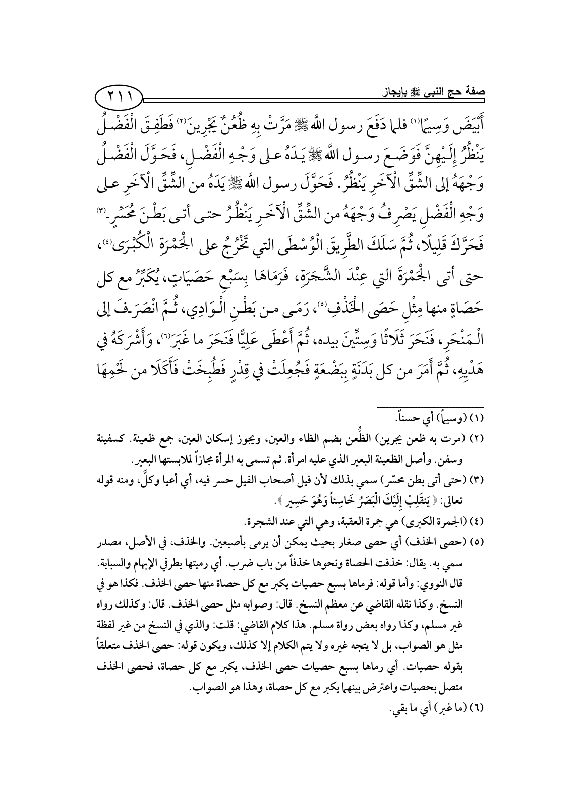 أَبْيَضَ وَسِيمًا (¬1) فلما دَفَعَ رسول اللَّه - صلى الله عليه وسلم - مَرَّتْ بِهِ ظُعُنٌ يَجْرِينَ (¬2) فَطَفِقَ الْفَضْلُ يَنْظُرُ إِلَيْهِنَّ فَوَضَعَ رسول اللَّه - صلى الله عليه وسلم - يَدَهُ على وَجْهِ الْفَضْلِ، فَحَوَّلَ الْفَضْلُ وَجْهَهُ إلى الشِّقِّ الْآخَرِ يَنْظُرُ. فَحَوَّلَ رسول اللَّه - صلى الله عليه وسلم - يَدَهُ من الشِّقِّ الْآخَرِ على وَجْهِ الْفَضْلِ يَصْرِفُ وَجْهَهُ من الشِّقِّ الْآخَرِ يَنْظُرُ حتى أتى بَطْنَ مُحَسِّرٍ (¬3) فَحَرَّكَ قَلِيلًا، ثُمَّ سَلَكَ الطَّرِيقَ الْوُسْطَى التي تَخْرُجُ على الْجَمْرَةِ الْكُبْرَى (¬4)، حتى أتى الْجَمْرَةَ التي عِنْدَ الشَّجَرَةِ، فَرَمَاهَا بِسَبْعِ حَصَيَاتٍ، يُكَبِّرُ مع كل حَصَاةٍ منها مِثْلِ حَصَى الْخَذْفِ (¬5)، رَمَى من بَطْنِ الْوَادِي، ثُمَّ انْصَرَفَ إلى الْمَنْحَرِ، فَنَحَرَ ثَلَاثًا وَسِتِّينَ بيده، ثُمَّ أَعْطَى عَلِيًّا
