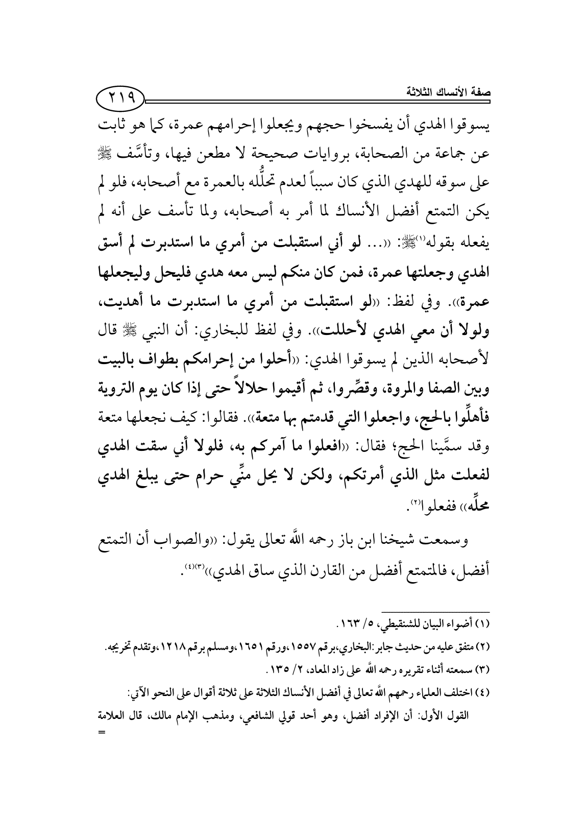 يسوقوا الهدي أن يفسخوا حجهم ويجعلوا إحرامهم عمرة، كما هو ثابت عن جماعة من الصحابة، بروايات صحيحة لا مطعن فيها، وتأسَّف - صلى الله عليه وسلم - على سوقه للهدي الذي كان سبباً لعدم تحلُّله بالعمرة مع أصحابه، فلو لم يكن التمتع أفضل الأنساك لما أمر به أصحابه، ولما تأسف على أنه لم يفعله بقوله (¬1) - صلى الله عليه وسلم -: (( ... لو أني استقبلت من أمري ما استدبرت لم أسق الهدي وجعلتها عمرة، فمن كان منكم ليس معه هدي فليحل وليجعلها عمرة)). وفي لفظ: ((لو استقبلت من أمري ما استدبرت ما أهديت، ولولا أن معي الهدي لأحللت)). وفي لفظ للبخاري: أن النبي - صلى الله عليه وسلم - قال لأصحابه الذين لم يسوقوا الهدي: ((أحلوا من إحرامكم بطواف بالبيت وبين الصفا والمروة، وقصِّروا، ثم أقيموا حلالاً حتى إذا كان يوم التروية فأهلِّوا بالحج، واجعلوا التي قدمتم بها متعة)). فقالوا: كيف نجعلها متعة وقد سمَّينا الحج؛ فقال: ((افعلوا ما آمركم به، فلولا أني سقت الهدي لفعلت مثل الذي أمرتكم، ولكن لا يحل منِّي حرام حتى يبلغ الهدي محلِّه)) ففعلوا (¬2).