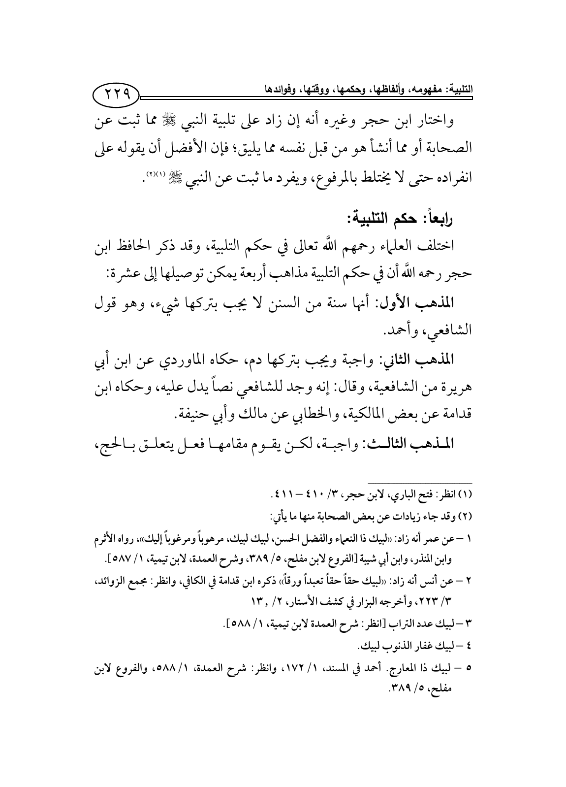 واختار ابن حجر وغيره أنه إن زاد على تلبية النبي - صلى الله عليه وسلم - مما ثبت عن الصحابة أو مما أنشأ هو من قبل نفسه مما يليق؛ فإن الأفضل أن يقوله على انفراده حتى لا يختلط بالمرفوع، ويفرد ما ثبت عن النبي - صلى الله عليه وسلم - (¬1) (¬2).