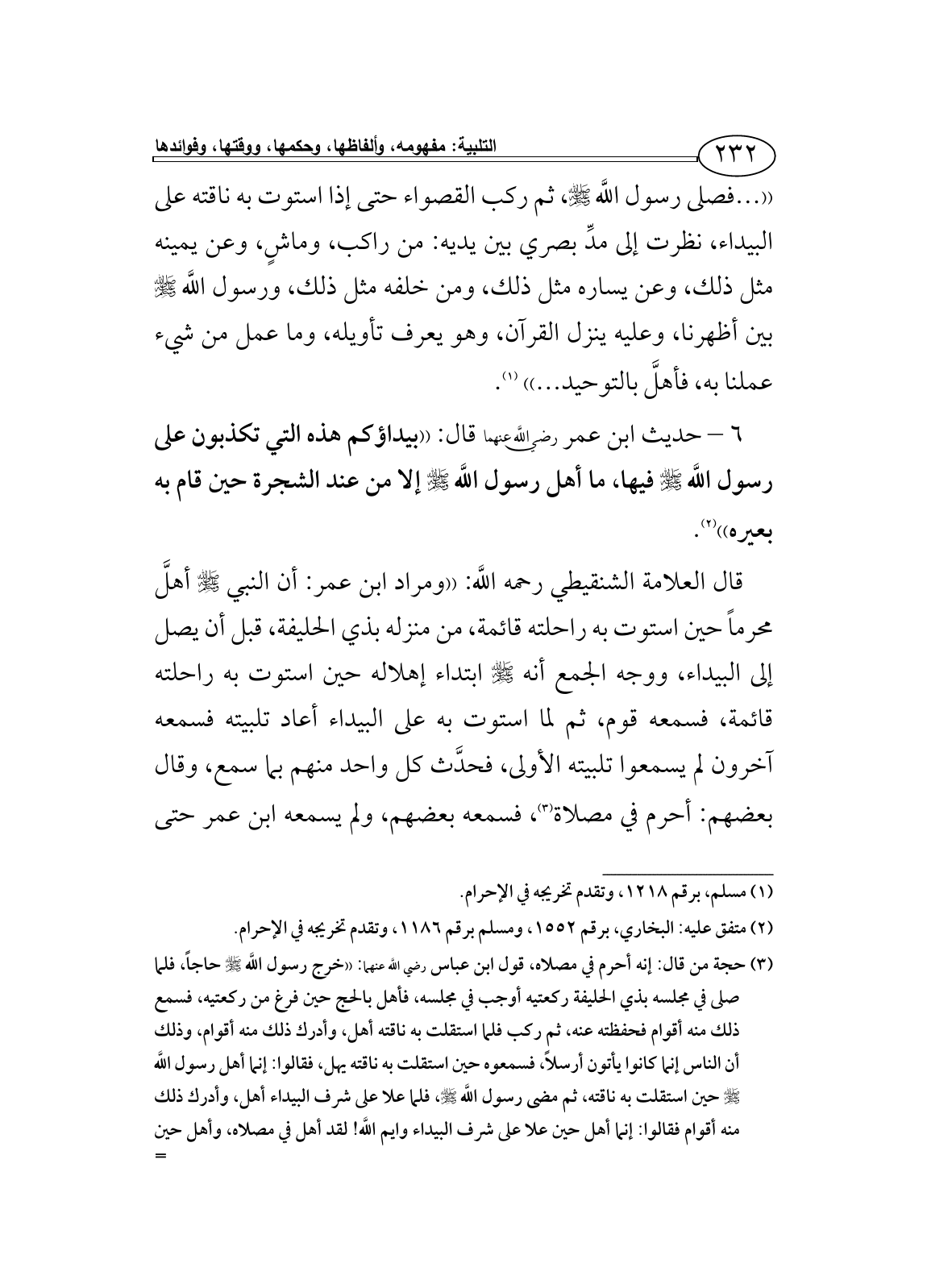 قال العلامة الشنقيطي رحمه اللَّه: ((ومراد ابن عمر: أن النبي - صلى الله عليه وسلم - أهلَّ محرماً حين استوت به راحلته قائمة، من منزله بذي الحليفة، قبل أن يصل إلى البيداء، ووجه الجمع أنه - صلى الله عليه وسلم - ابتداء إهلاله حين استوت به راحلته قائمة، فسمعه قوم، ثم لما استوت به على البيداء أعاد تلبيته فسمعه آخرون لم يسمعوا تلبيته الأولى، فحدَّث كل واحد منهم بما سمع، وقال