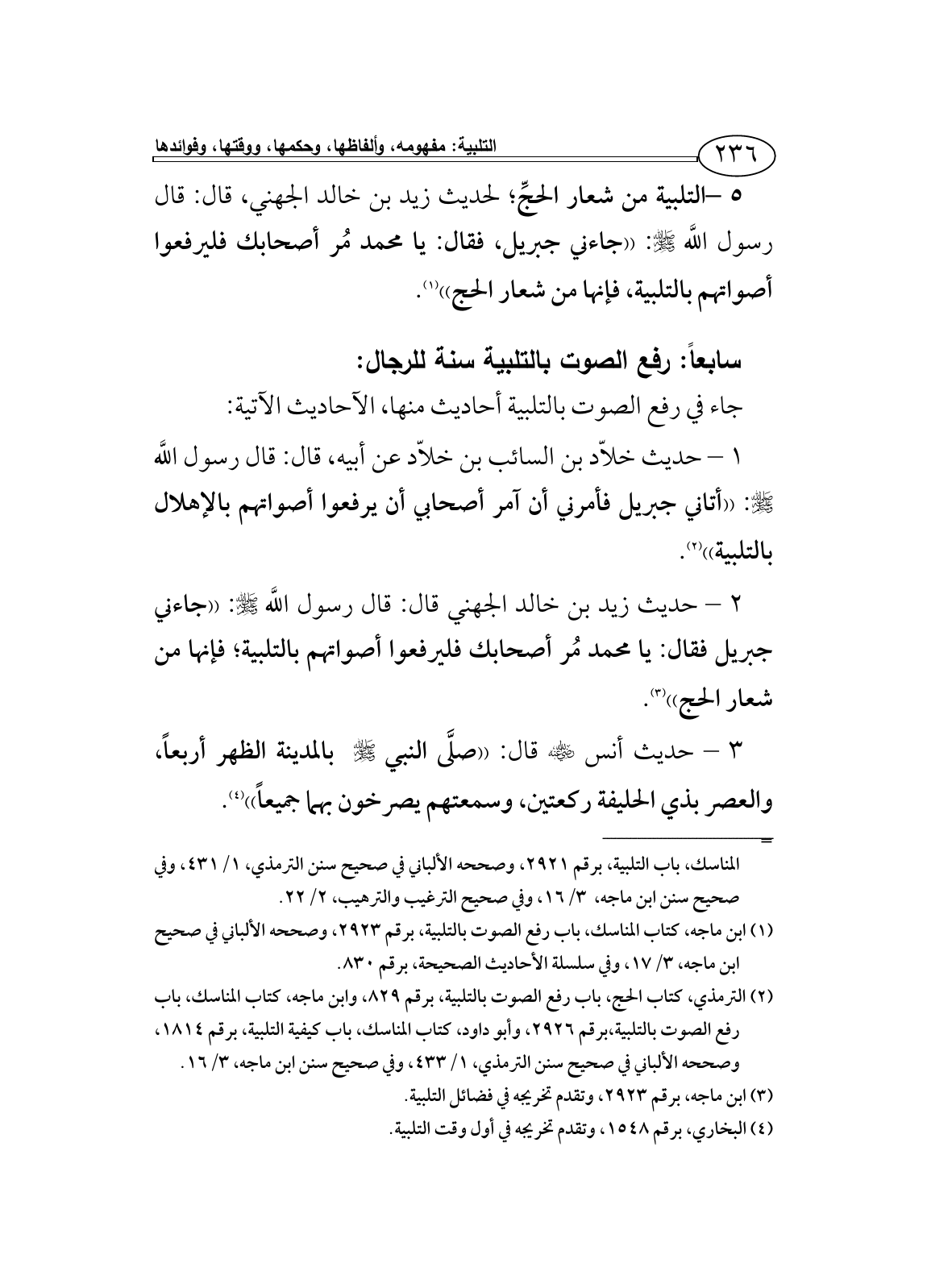 2 - حديث زيد بن خالد الجهني قال: قال رسول اللَّه - صلى الله عليه وسلم -: ((جاءني جبريل فقال: يا محمد مُر أصحابك فليرفعوا أصواتهم بالتلبية؛ فإنها من شعار الحج)) (¬3).