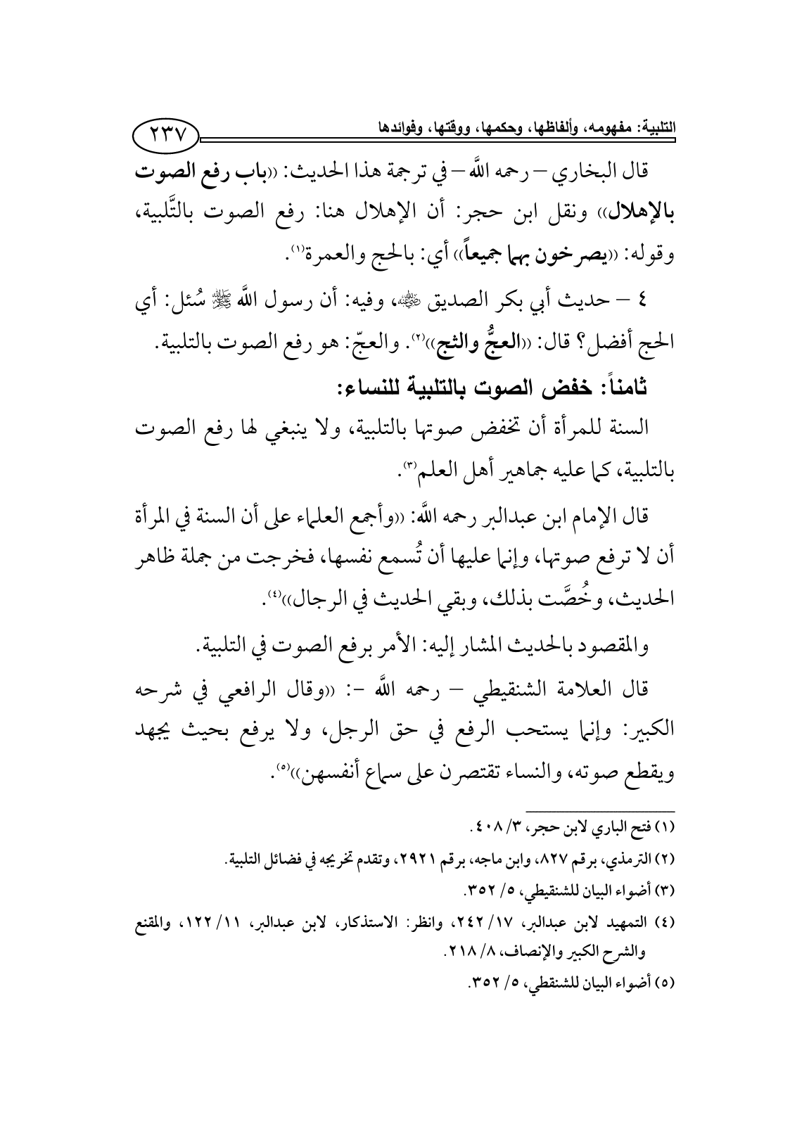 قال العلامة الشنقيطي - رحمه اللَّه -: ((وقال الرافعي في شرحه الكبير: وإنما يستحب الرفع في حق الرجل، ولا يرفع بحيث يجهد ويقطع صوته، والنساء تقتصرن على سماع أنفسهن)) (¬5).