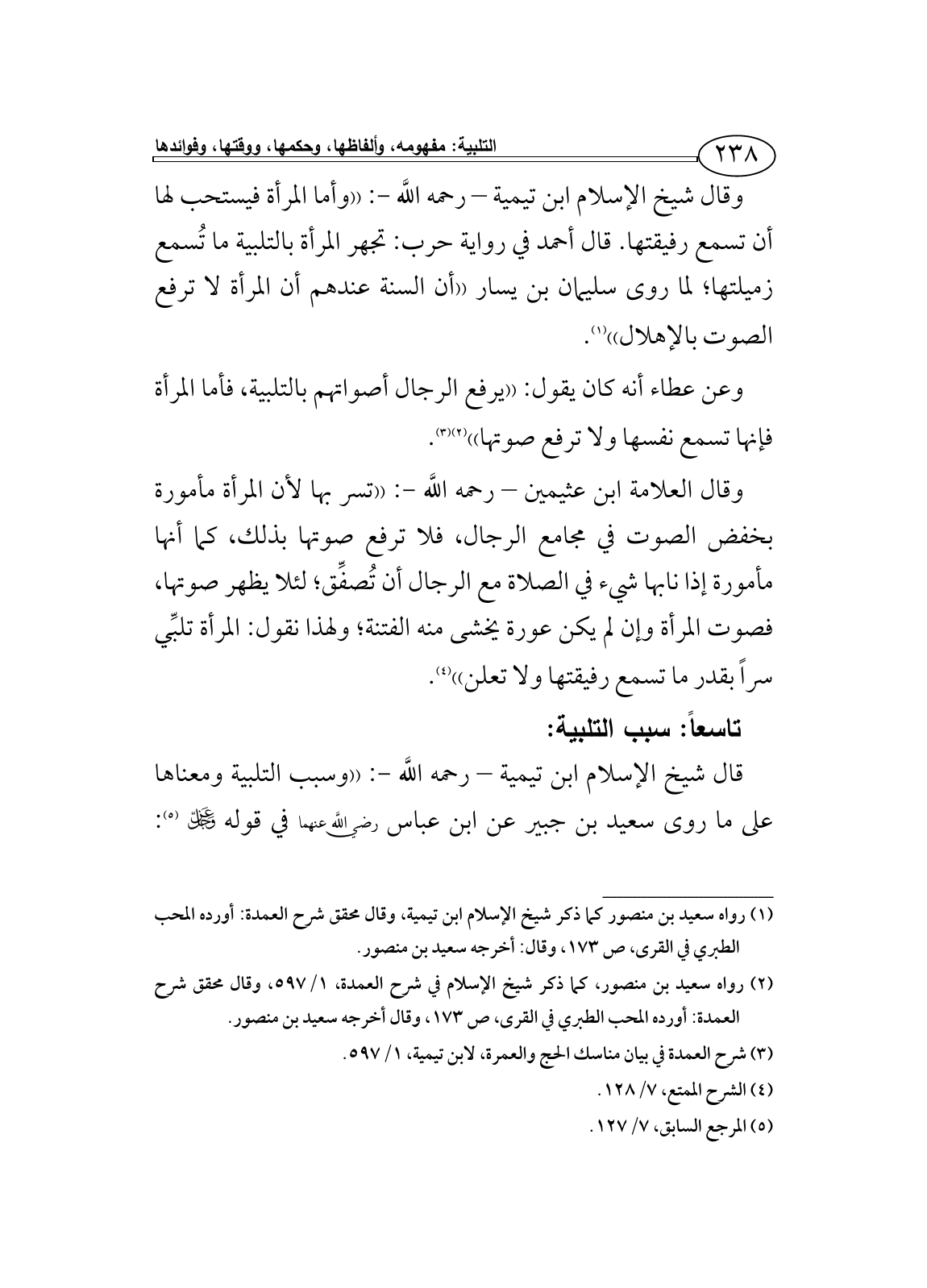 وقال شيخ الإسلام ابن تيمية - رحمه اللَّه -: ((وأما المرأة فيستحب لها أن تسمع رفيقتها. قال أحمد في رواية حرب: تجهر المرأة بالتلبية ما تُسمع زميلتها؛ لما روى سليمان بن يسار ((أن السنة عندهم أن المرأة لا ترفع الصوت بالإهلال)) (¬1).