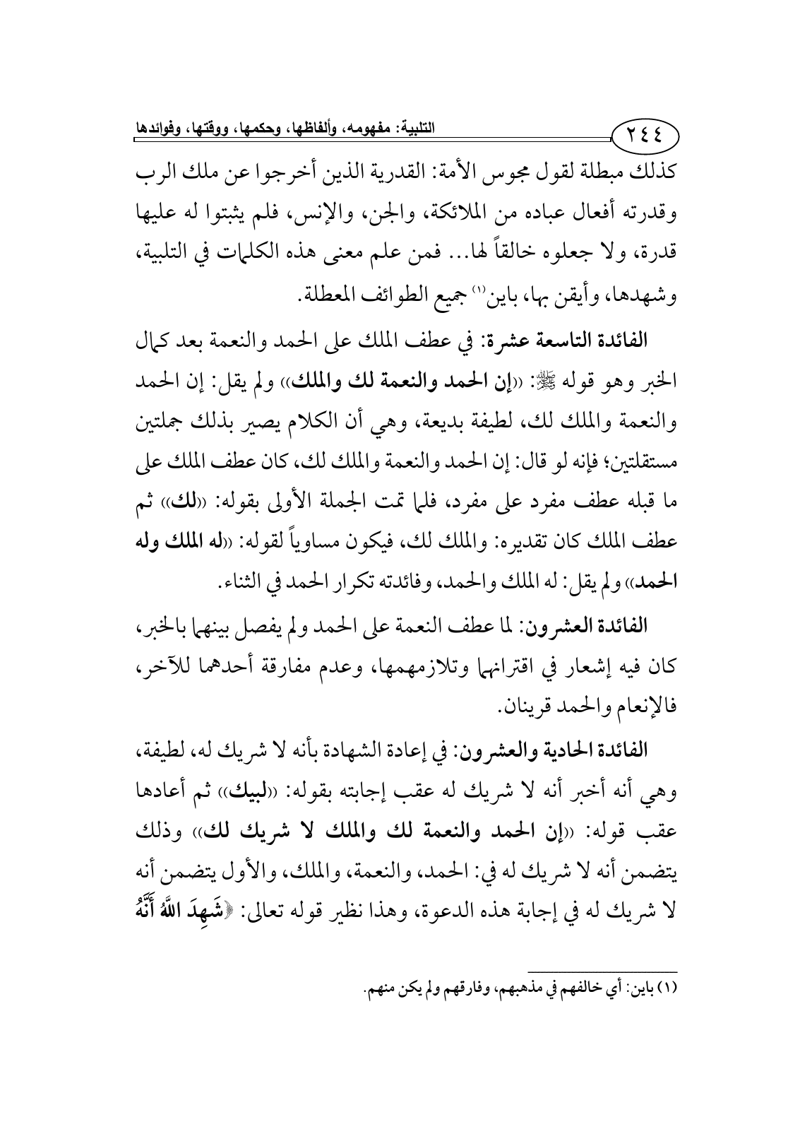 كذلك مبطلة لقول مجوس الأمة: القدرية الذين أخرجوا عن ملك الرب وقدرته أفعال عباده من الملائكة، والجن، والإنس، فلم يثبتوا له عليها قدرة، ولا جعلوه خالقاً لها ... فمن علم معنى هذه الكلمات في التلبية، وشهدها، وأيقن بها، باين (¬1) جميع الطوائف المعطلة.