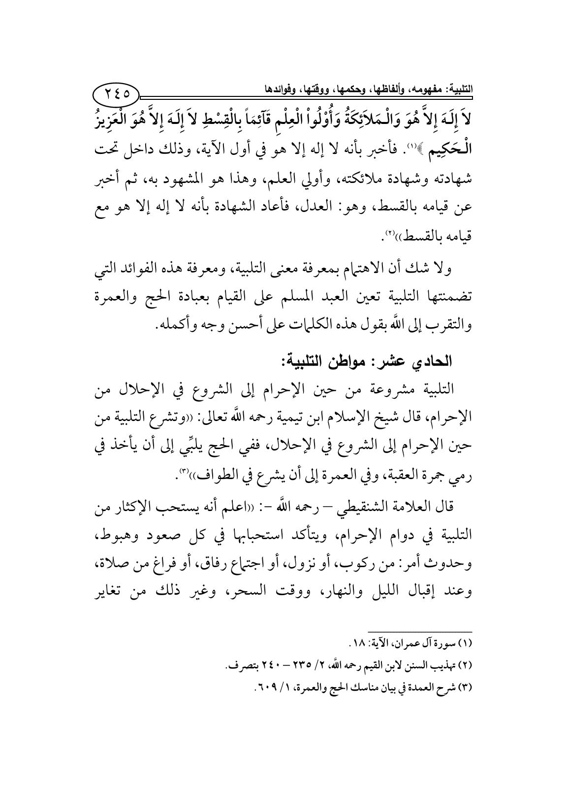 قال العلامة الشنقيطي - رحمه اللَّه -: ((اعلم أنه يستحب الإكثار من التلبية في دوام الإحرام، ويتأكد استحبابها في كل صعود وهبوط، وحدوث أمر: من ركوب، أو نزول، أو اجتماع رفاق، أو فراغ من صلاة، وعند إقبال الليل والنهار، ووقت السحر، وغير ذلك من تغاير