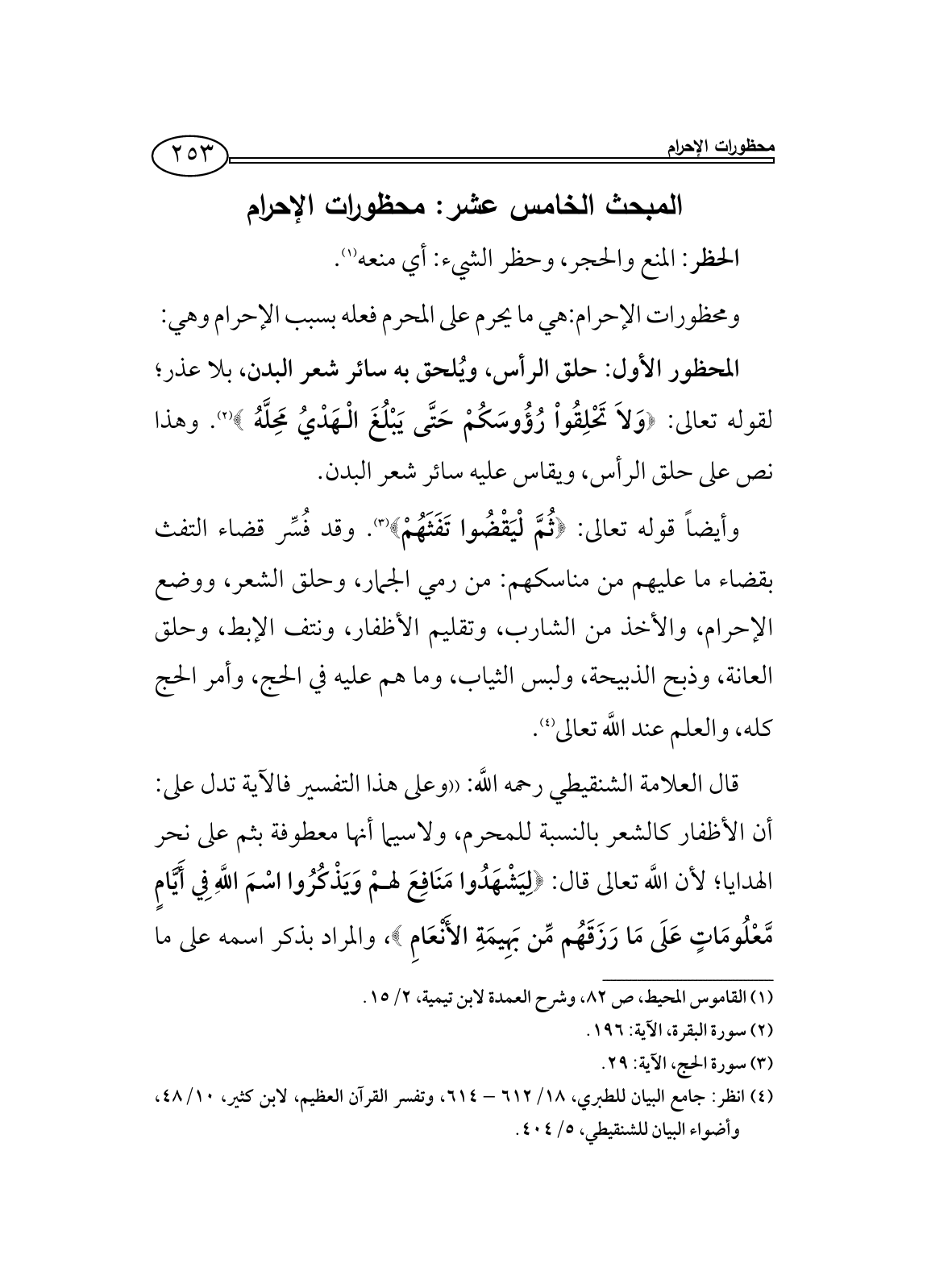المحظور الأول: حلق الرأس، ويُلحق به سائر شعر البدن، بلا عذر؛ لقوله تعالى: {وَلاَ تَحْلِقُواْ رُؤُوسَكُمْ حَتَّى يَبْلُغَ الْهَدْيُ مَحِلَّهُ} (¬2). وهذا نص على حلق الرأس، ويقاس عليه سائر شعر البدن.