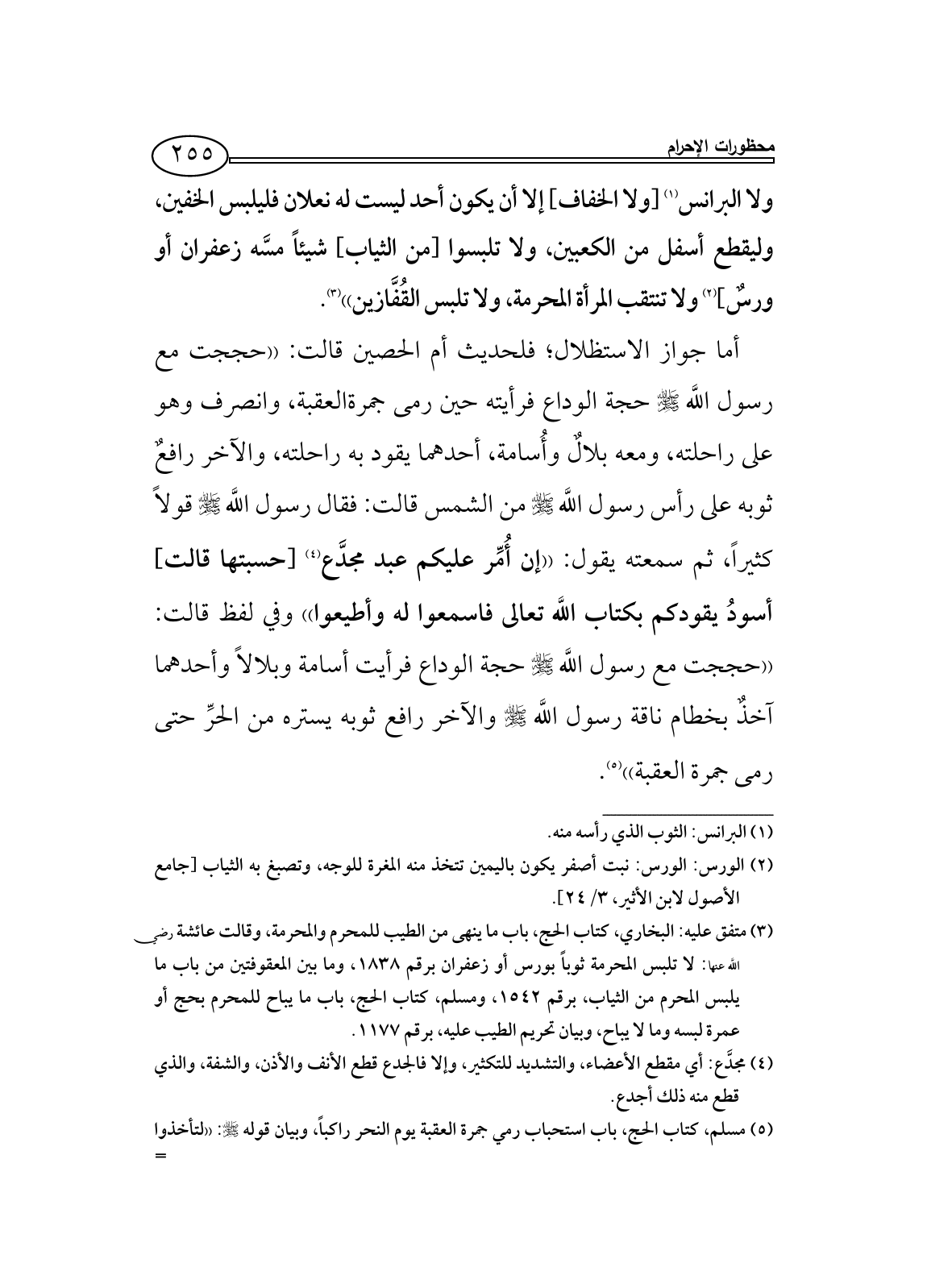 (¬3) متفق عليه: البخاري، كتاب الحج، باب ما ينهى من الطيب للمحرم والمحرمة، وقالت عائشة رضي اللَّه عنها: لا تلبس المحرمة ثوباً بورس أو زعفران برقم 1838، وما بين المعقوفتين من باب ما يلبس المحرم من الثياب، برقم 1542، ومسلم، كتاب الحج، باب ما يباح للمحرم بحج أو عمرة لبسه وما لا يباح، وبيان تحريم الطيب عليه، برقم 1177.