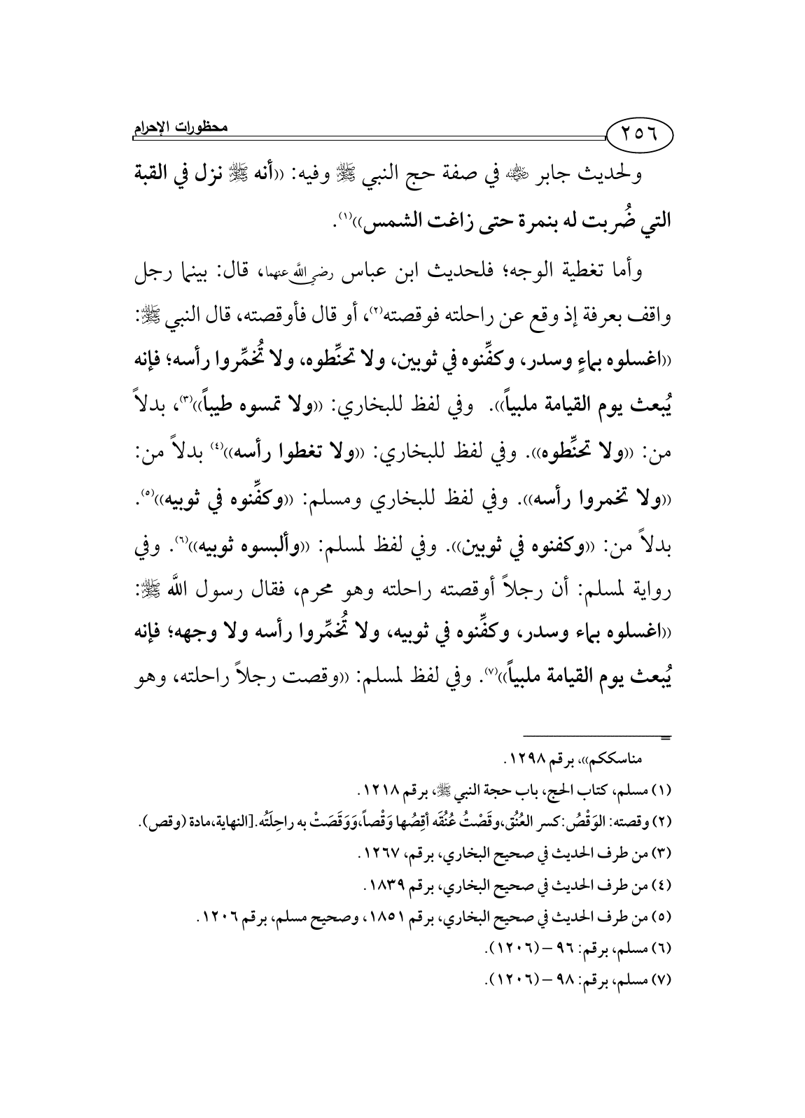 وأما تغطية الوجه؛ فلحديث ابن عباس رضي اللَّه عنهما، قال: بينما رجل واقف بعرفة إذ وقع عن راحلته فوقصته (¬2)، أو قال فأوقصته، قال النبي - صلى الله عليه وسلم -: ((اغسلوه بماءٍ وسدر، وكفِّنوه في ثوبين، ولا تحنِّطوه، ولا تُخمِّروا رأسه؛ فإنه يُبعث يوم القيامة ملبياً)). وفي لفظ للبخاري: ((ولا تمسوه طيباً)) (¬3)، بدلاً من: ((ولا تحنِّطوه)). وفي لفظ للبخاري: ((ولا تغطوا رأسه)) (¬4) بدلاً من: ((ولا تخمروا رأسه)). وفي لفظ للبخاري ومسلم: ((وكفِّنوه في ثوبيه)) (¬5). بدلاً من: ((وكفنوه في ثوبين)). وفي لفظ لمسلم: ((وألبسوه ثوبيه)) (¬6). وفي رواية لمسلم: أن رجلاً أوقصته راحلته وهو محرم، فقال رسول اللَّه - صلى الله عليه وسلم -: