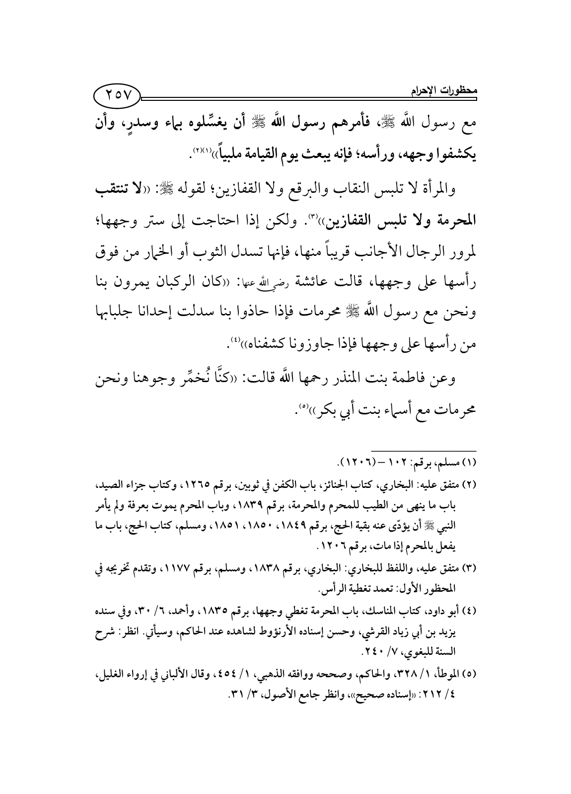 (¬3) متفق عليه، واللفظ للبخاري: البخاري، برقم 1838، ومسلم، برقم 1177، وتقدم تخريجه في المحظور الأول: تعمد تغطية الرأس.