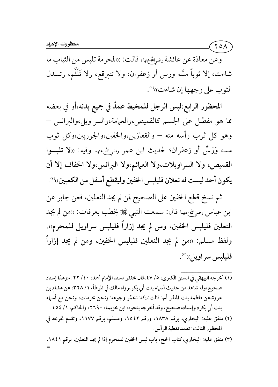(¬3) متفق عليه: البخاري، كتاب الحج، باب لبس الخفين للمحرم إذا لم يجد النعلين، برقم 1841، ومسلم، كتاب الحج، باب ما يباح للمحرم بحج أو عمرة، برقم 1179.