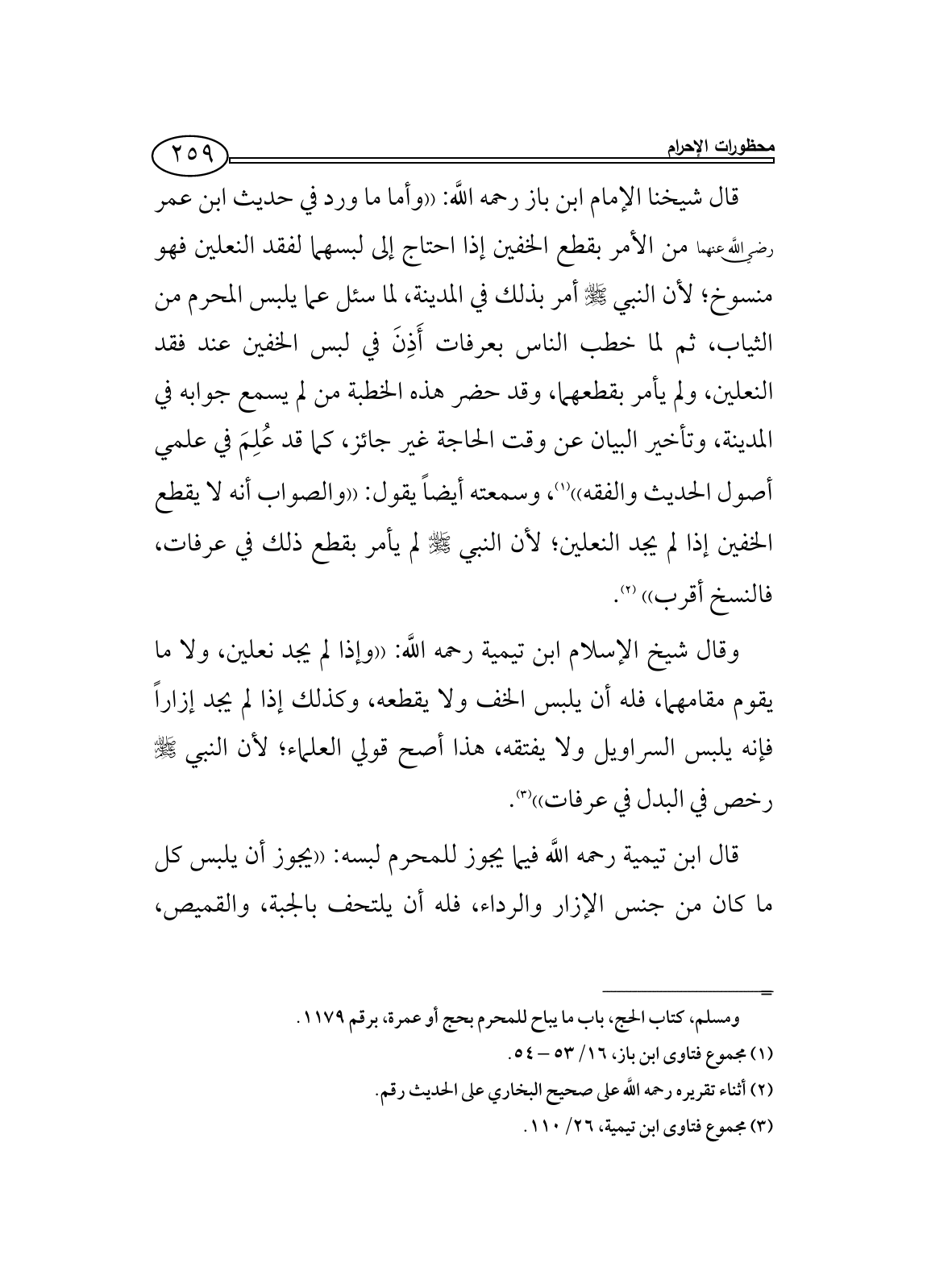 قال شيخنا الإمام ابن باز رحمه اللَّه: ((وأما ما ورد في حديث ابن عمر رضي اللَّه عنهما من الأمر بقطع الخفين إذا احتاج إلى لبسهما لفقد النعلين فهو منسوخ؛ لأن النبي - صلى الله عليه وسلم - أمر بذلك في المدينة، لما سئل عما يلبس المحرم من الثياب، ثم لما خطب الناس بعرفات أَذِنَ في لبس الخفين عند فقد النعلين، ولم يأمر بقطعهما، وقد حضر هذه الخطبة من لم يسمع جوابه في المدينة، وتأخير البيان عن وقت الحاجة غير جائز، كما قد عُلِمَ في علمي أصول الحديث والفقه)) (¬1)، وسمعته أيضاً يقول: ((والصواب أنه لا يقطع الخفين إذا لم يجد النعلين؛ لأن النبي - صلى الله عليه وسلم - لم يأمر بقطع ذلك في عرفات، فالنسخ أقرب)) (¬2).