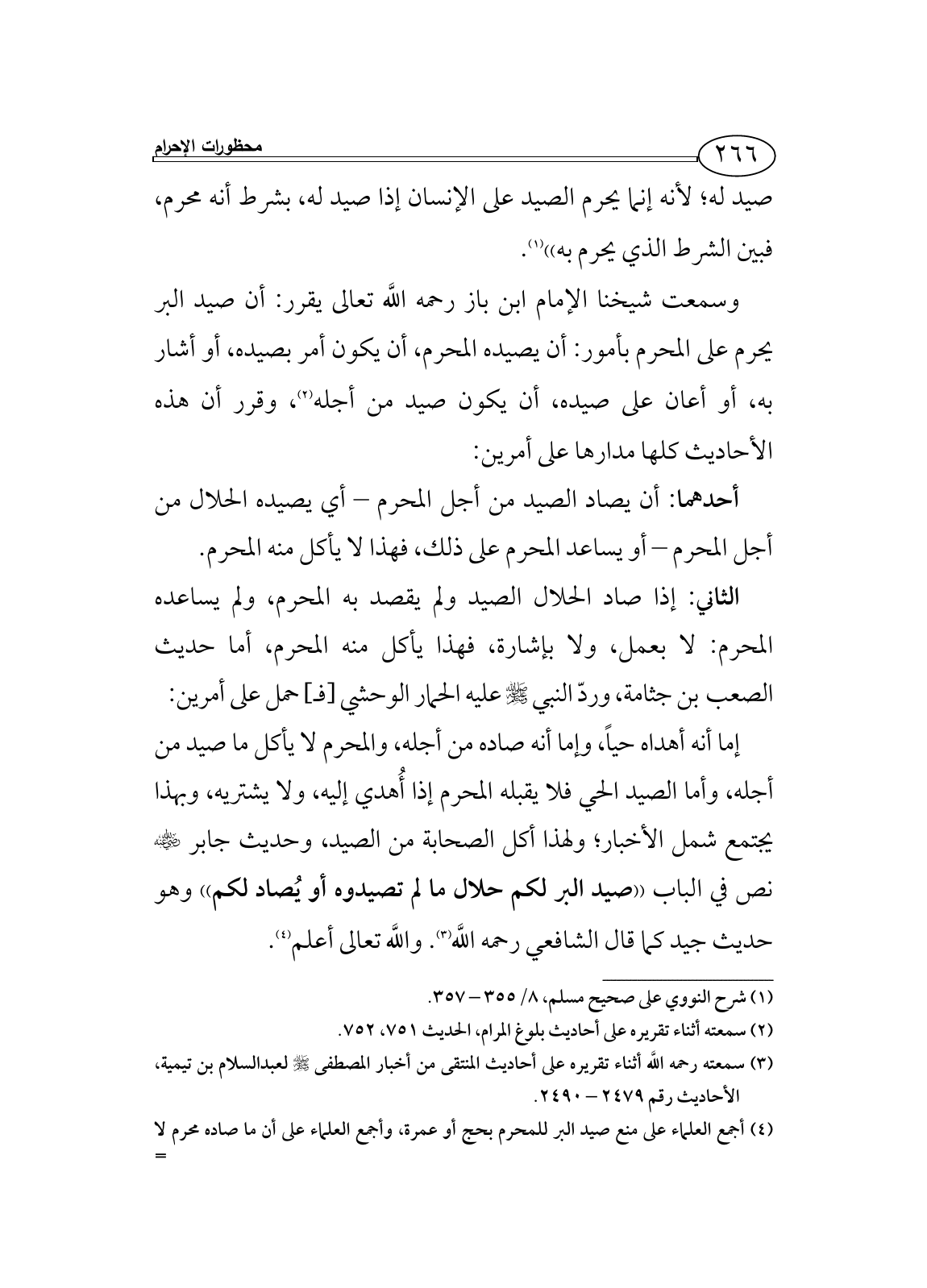 وسمعت شيخنا الإمام ابن باز رحمه اللَّه تعالى يقرر: أن صيد البر يحرم على المحرم بأمور: أن يصيده المحرم، أن يكون أمر بصيده، أو أشار به، أو أعان على صيده، أن يكون صيد من أجله (¬2)، وقرر أن هذه الأحاديث كلها مدارها على أمرين: