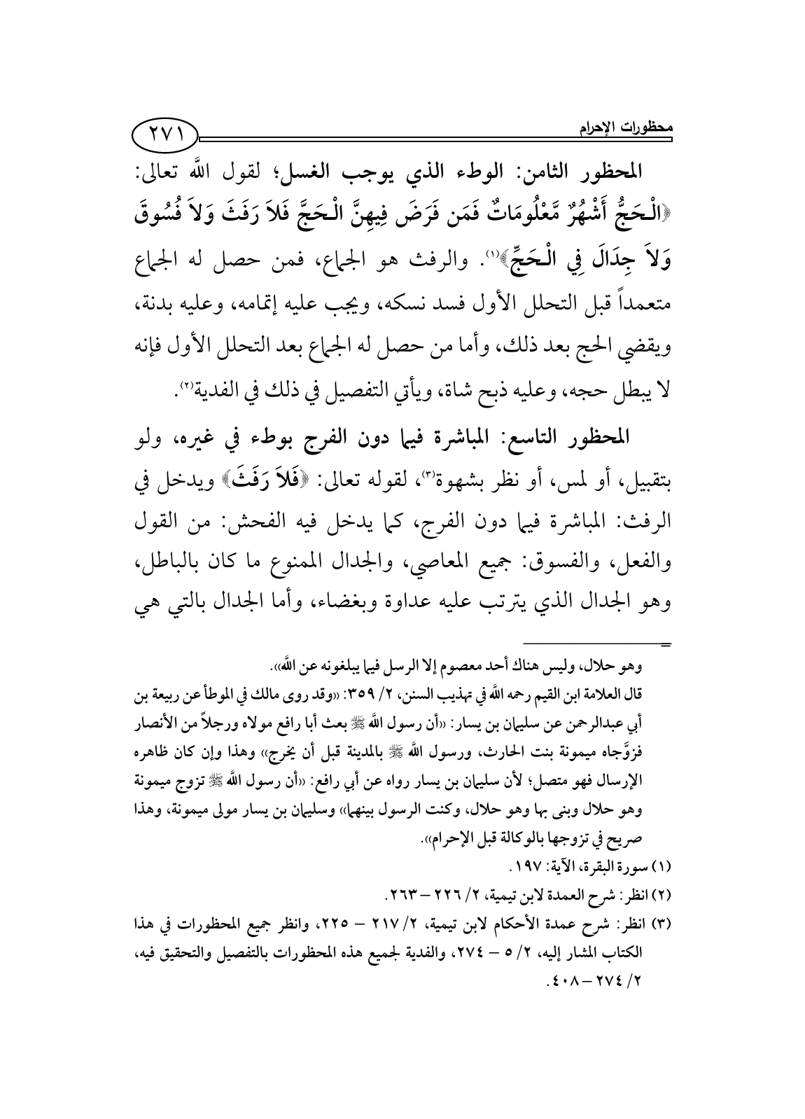 المحظور التاسع: المباشرة فيما دون الفرج بوطء في غيره، ولو بتقبيل، أو لمس، أو نظر بشهوة (¬3)، لقوله تعالى: {فَلاَ رَفَثَ} ويدخل في الرفث: المباشرة فيما دون الفرج، كما يدخل فيه الفحش: من القول والفعل، والفسوق: جميع المعاصي، والجدال الممنوع ما كان بالباطل، وهو الجدال الذي يترتب عليه عداوة وبغضاء، وأما الجدال بالتي هي أحسن لإظهار الحق فهو مأمور به، لقول اللَّه تعالى: {وَجَادِلهم بِالَّتِي هِيَ أَحْسَنُ} (¬4)، وقوله تعالى: {وَلاَ تُجَادِلُوا أَهْلَ الْكِتَابِ إِلاَّ بِالَّتِي هِيَ