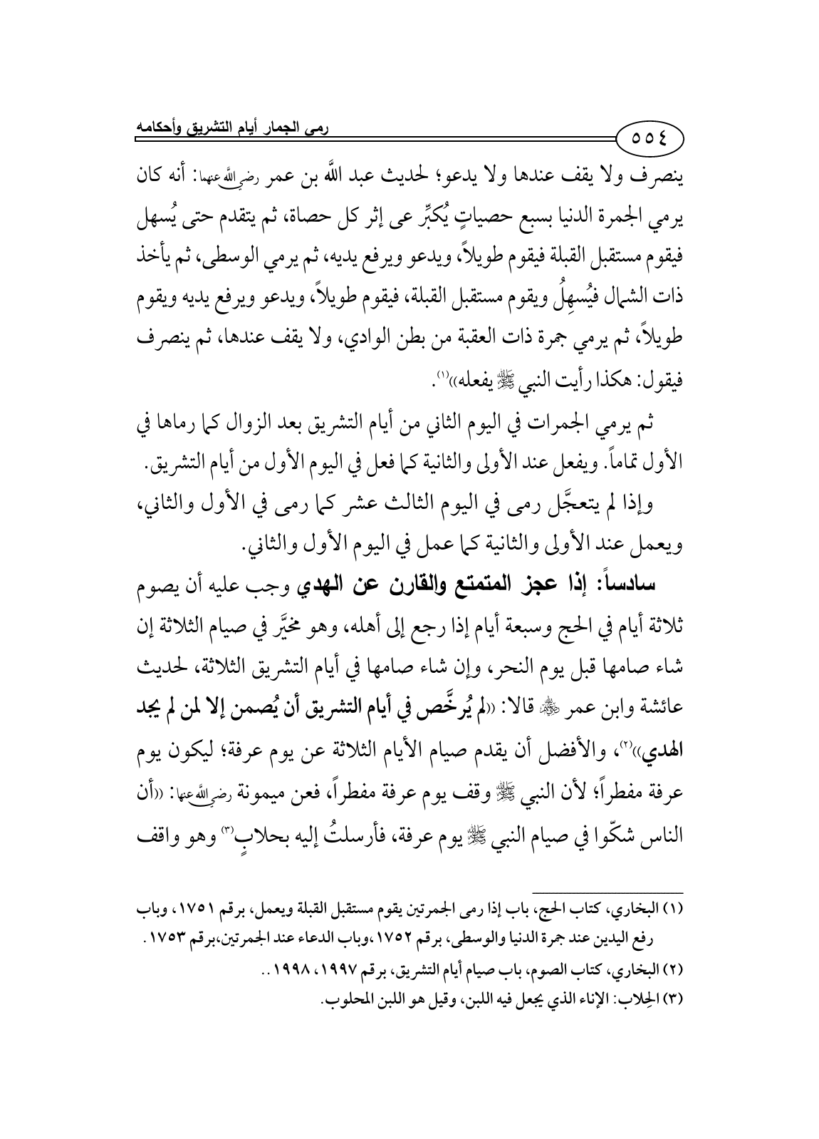 سادساً: إذا عجز المتمتع والقارن عن الهدي وجب عليه أن يصوم ثلاثة أيام في الحج وسبعة أيام إذا رجع إلى أهله، وهو مخيَّر في صيام الثلاثة إن شاء صامها قبل يوم النحر، وإن شاء صامها في أيام التشريق الثلاثة، لحديث عائشة وابن عمر - رضي الله عنهم - قالا: ((لم يُرخَّص في أيام التشريق أن يُصمن إلا لمن لم يجد الهدي)) (¬2)، والأفضل أن يقدم صيام الأيام الثلاثة عن يوم عرفة؛ ليكون يوم عرفة مفطراً؛ لأن النبي - صلى الله عليه وسلم - وقف يوم عرفة مفطراً، فعن ميمونة رضي اللَّه عنها: ((أن