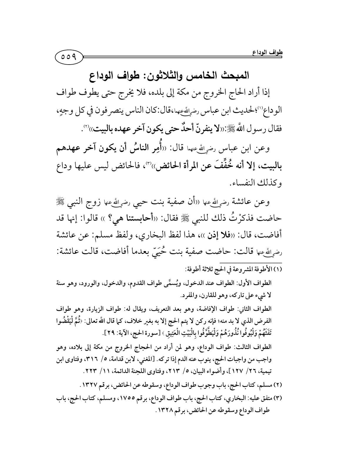 (¬3) متفق عليه: البخاري، كتاب الحج، باب طواف الوداع، برقم 1755، ومسلم، كتاب الحج، باب طواف الوداع وسقوطه عن الحائض، برقم 1328.