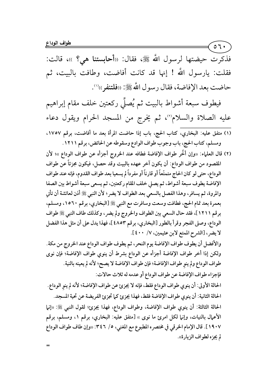(¬1) متفق عليه: البخاري، كتاب الحج، باب إذا حاضت المرأة بعد ما أفاضت، برقم 1757، ومسلم، كتاب الحج، باب وجوب طواف الوادع وسقوطه عن الحائض، برقم 1211.
