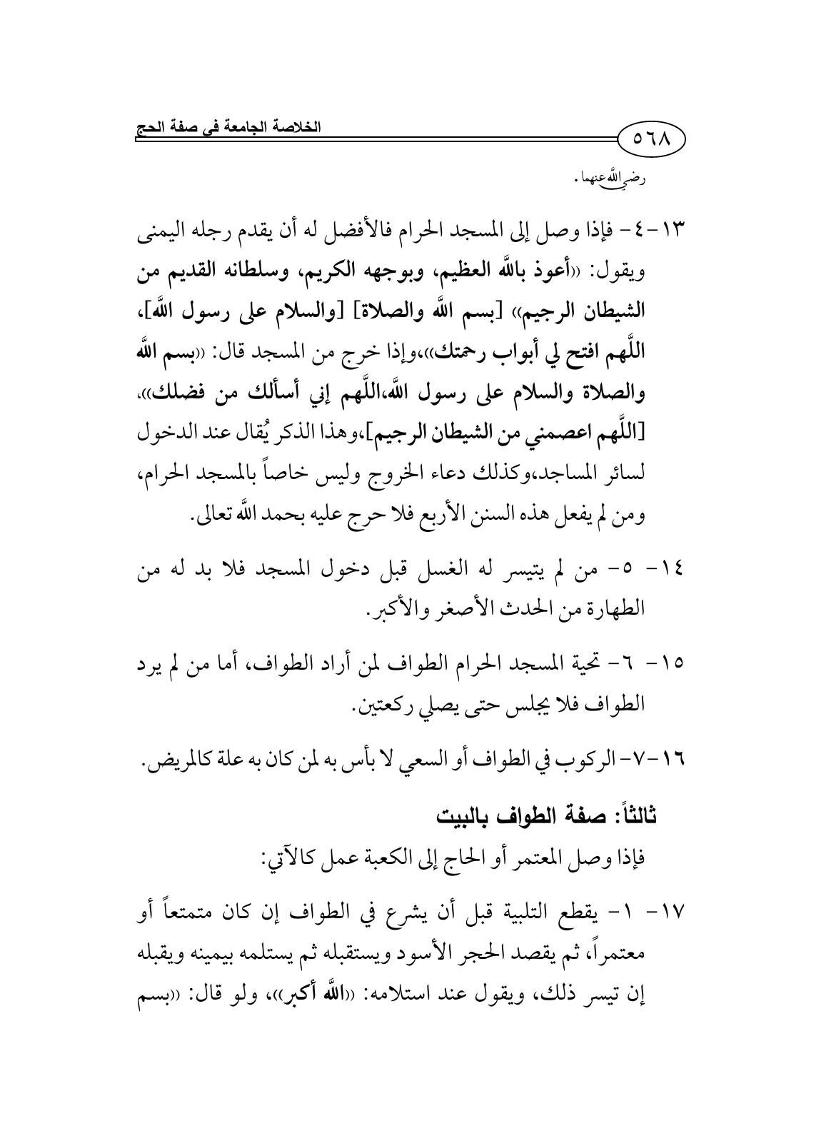 13 - 4 - فإذا وصل إلى المسجد الحرام فالأفضل له أن يقدم رجله اليمنى ويقول: ((أعوذ باللَّه العظيم، وبوجهه الكريم، وسلطانه القديم من الشيطان الرجيم)) [بسم اللَّه والصلاة] [والسلام على رسول اللَّه]، اللَّهم افتح لي أبواب رحمتك))،وإذا خرج من المسجد قال: ((بسم اللَّه والصلاة والسلام على رسول اللَّه، اللَّهم إني أسألك من فضلك))، [اللَّهم اعصمني من الشيطان الرجيم]،وهذا الذكر يُقال عند الدخول لسائر المساجد، وكذلك دعاء الخروج وليس خاصاً بالمسجد الحرام، ومن لم يفعل هذه السنن الأربع فلا حرج عليه بحمد اللَّه تعالى.