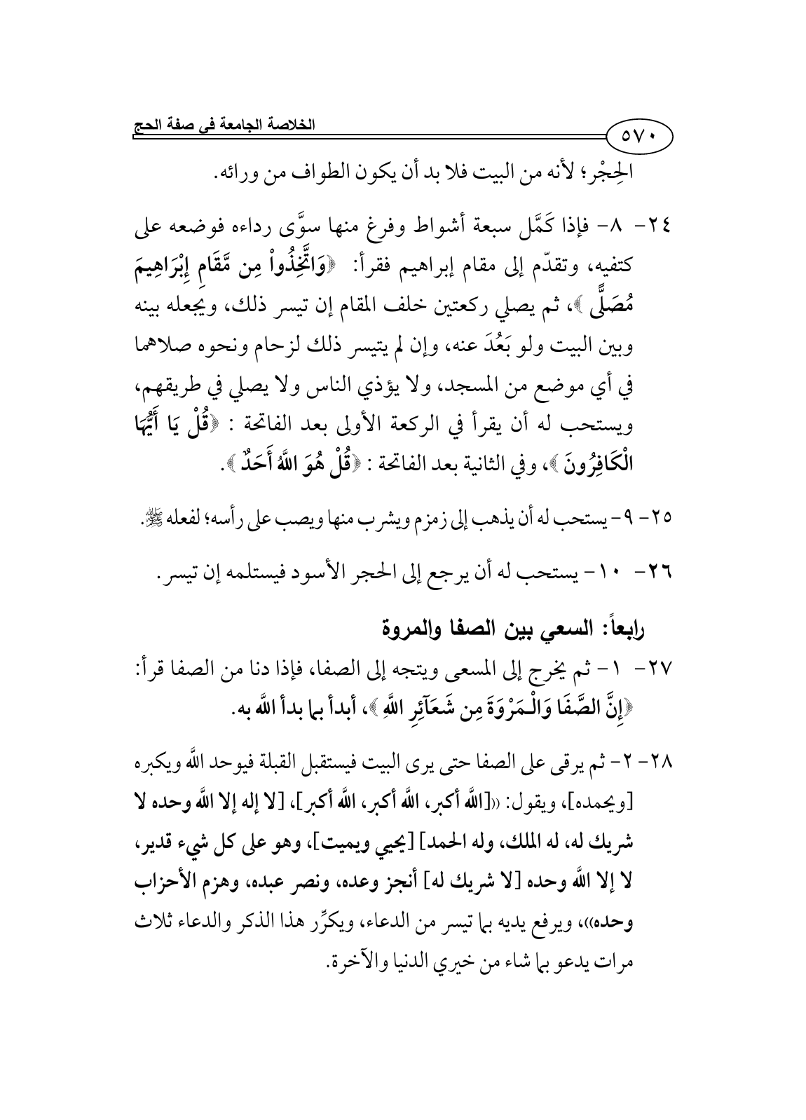 24 - 8 - فإذا كَمَّل سبعة أشواط وفرغ منها سوَّى رداءه فوضعه على كتفيه، وتقدّم إلى مقام إبراهيم فقرأ: {وَاتَّخِذُواْ مِن مَّقَامِ إِبْرَاهِيمَ مُصَلًّى}، ثم يصلي ركعتين خلف المقام إن تيسر ذلك، ويجعله بينه وبين البيت ولو بَعُدَ عنه، وإن لم يتيسر ذلك لزحام ونحوه صلاهما في أي موضع من المسجد، ولا يؤذي الناس ولا يصلي في طريقهم، ويستحب له أن يقرأ في الركعة الأولى بعد الفاتحة: {قُلْ يَا أَيُّهَا الْكَافِرُونَ}، وفي الثانية بعد الفاتحة: {قُلْ هُوَ اللَّهُ أَحَدٌ}.
