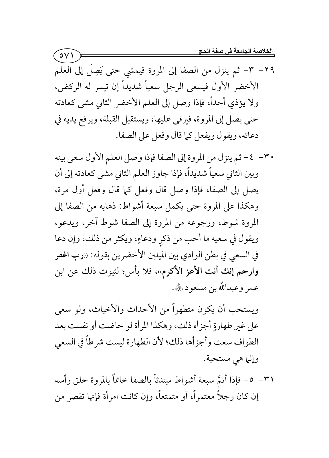 30 - 4 - ثم ينزل من المروة إلى الصفا فإذا وصل العلم الأول سعى بينه وبين الثاني سعياً شديداً، فإذا جاوز العلم الثاني مشى كعادته إلى أن يصل إلى الصفا، فإذا وصل قال وفعل كما قال وفعل أول مرة، وهكذا على المروة حتى يكمل سبعة أشواط: ذهابه من الصفا إلى المروة شوط، ورجوعه من المروة إلى الصفا شوط آخر، ويدعو، ويقول في سعيه ما أحب من ذكرٍ ودعاءٍ، ويكثر من ذلك، وإن دعا في السعي في بطن الوادي بين الميلين الأخضرين بقوله: ((رب اغفر وارحم إنك أنت الأعز الأكرم))، فلا بأس؛ لثبوت ذلك عن ابن عمر وعبد اللَّه بن مسعود - رضي الله عنهم -.