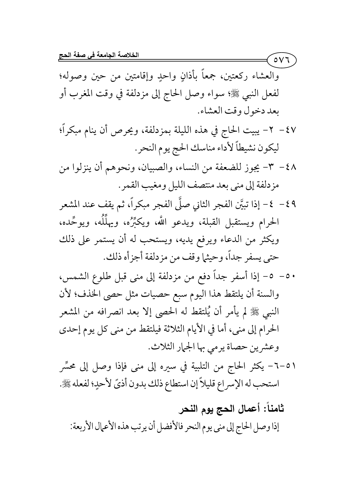 51 - 6 - يكثر الحاج من التلبية في سيره إلى منى فإذا وصل إلى محسِّر استحب له الإسراع قليلاً إن استطاع ذلك بدون أذىً لأحدٍ؛ لفعله - صلى الله عليه وسلم -.
