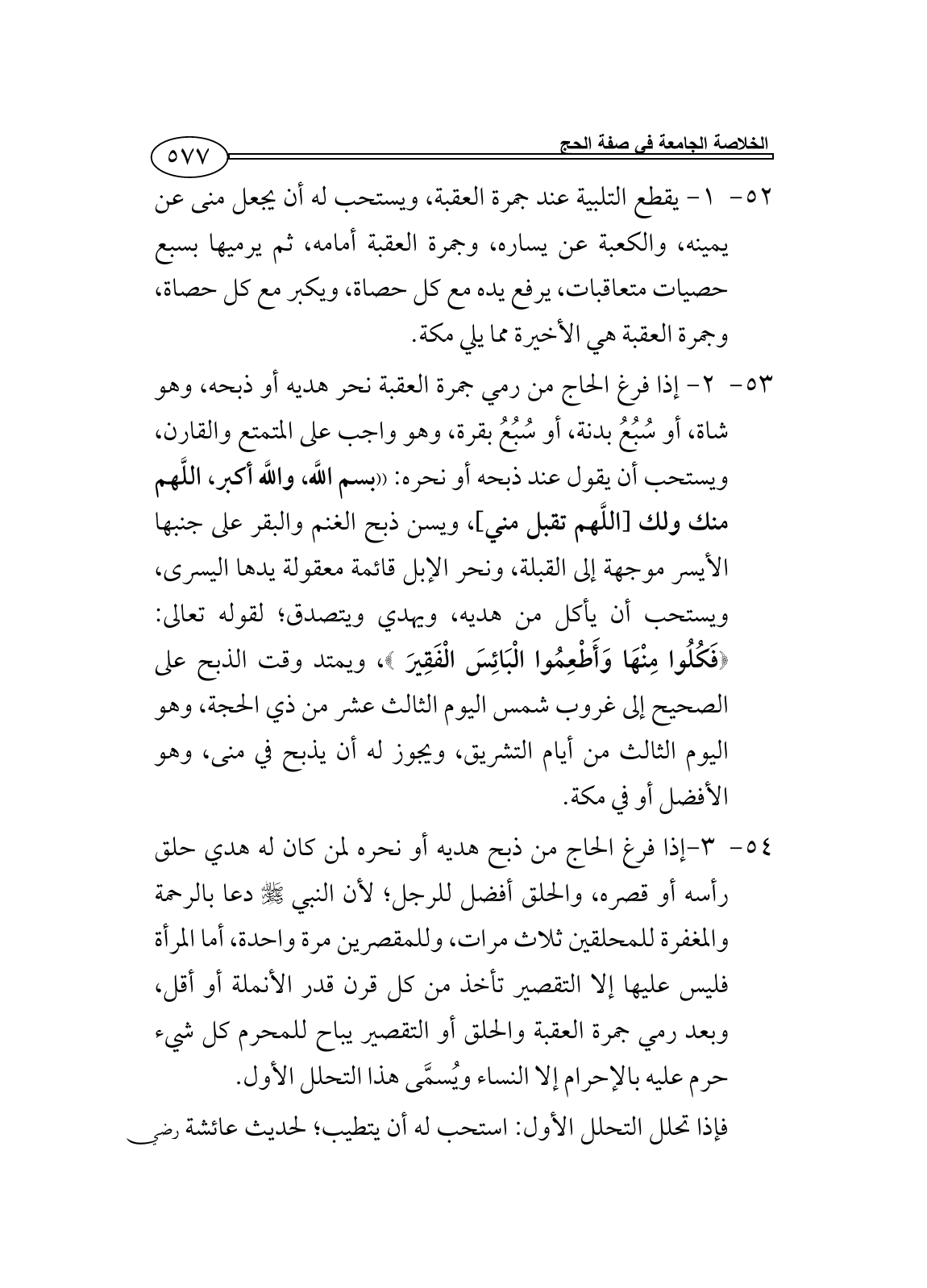 53 - 2 - إذا فرغ الحاج من رمي جمرة العقبة نحر هديه أو ذبحه، وهو شاة، أو سُبُعُ بدنة، أو سُبُعُ بقرة، وهو واجب على المتمتع والقارن، ويستحب أن يقول عند ذبحه أو نحره: ((بسم اللَّه، واللَّه أكبر، اللَّهم منك ولك [اللَّهم تقبل مني]، ويسن ذبح الغنم والبقر على جنبها الأيسر موجهة إلى القبلة، ونحر الإبل قائمة معقولة يدها اليسرى، ويستحب أن يأكل من هديه، ويهدي ويتصدق؛ لقوله تعالى: