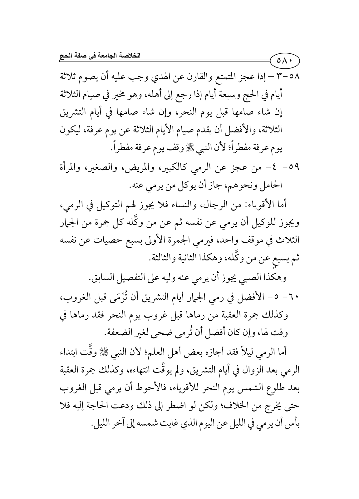59 - 4 - من عجز عن الرمي كالكبير، والمريض، والصغير، والمرأة الحامل ونحوهم، جاز أن يوكل من يرمي عنه.