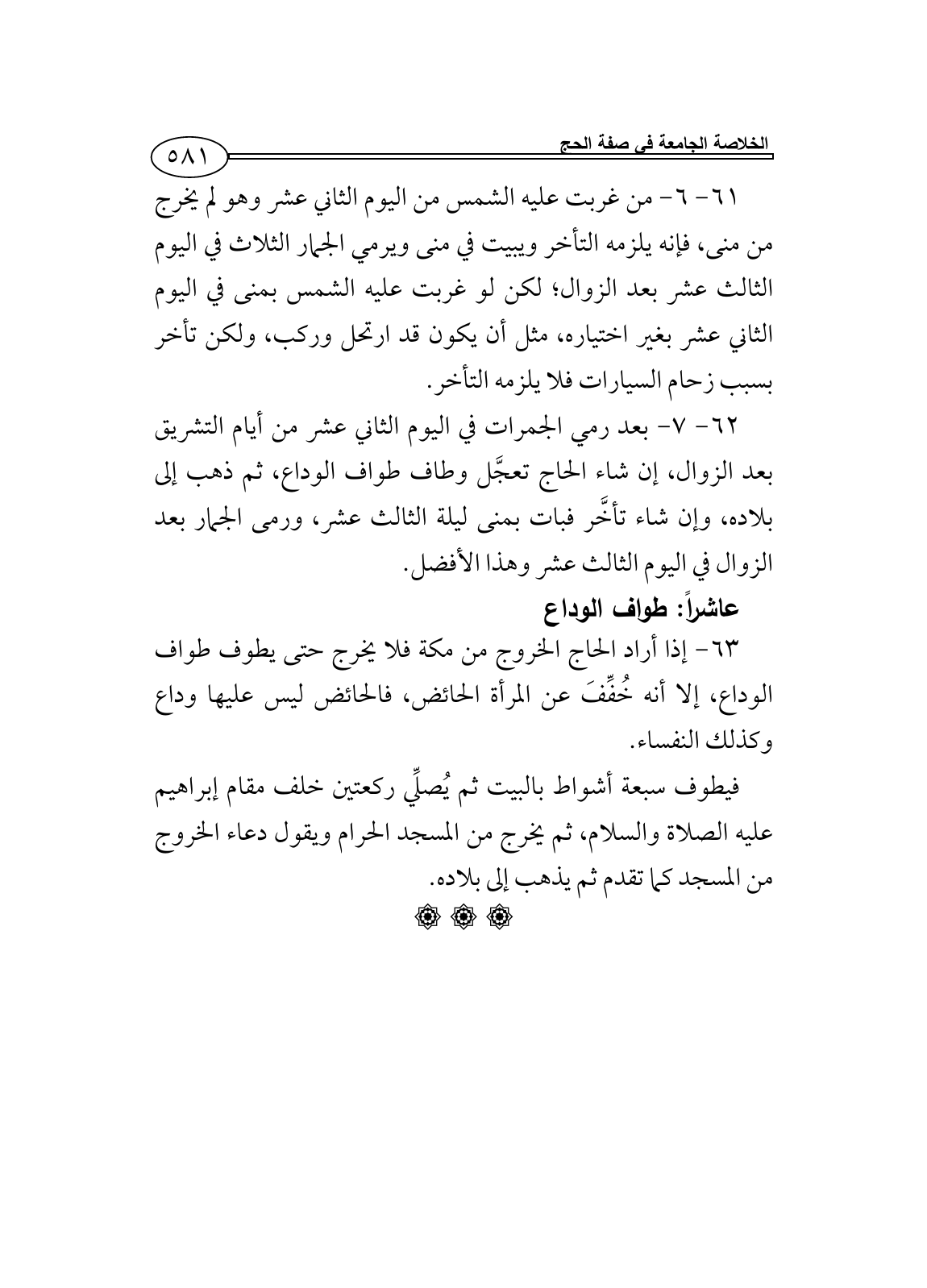 63 - إذا أراد الحاج الخروج من مكة فلا يخرج حتى يطوف طواف الوداع، إلا أنه خُفِّفَ عن المرأة الحائض، فالحائض ليس عليها وداع وكذلك النفساء.