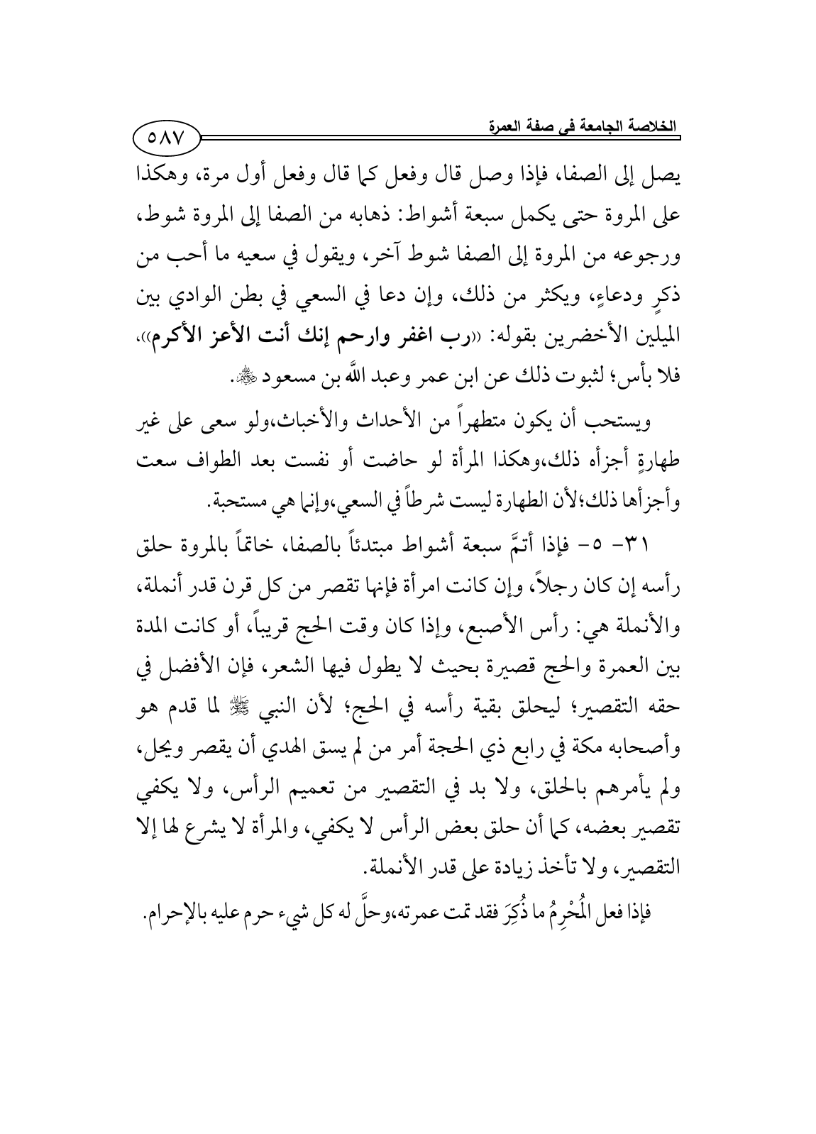 31 - 5 - فإذا أتمَّ سبعة أشواط مبتدئاً بالصفا، خاتماً بالمروة حلق رأسه إن كان رجلاً، وإن كانت امرأة فإنها تقصر من كل قرن قدر أنملة، والأنملة هي: رأس الأصبع، وإذا كان وقت الحج قريباً، أو كانت المدة بين العمرة والحج قصيرة بحيث لا يطول فيها الشعر، فإن الأفضل في حقه التقصير؛ ليحلق بقية رأسه في الحج؛ لأن النبي - صلى الله عليه وسلم - لما قدم هو وأصحابه مكة في رابع ذي الحجة أمر من لم يسق الهدي أن يقصر ويحل، ولم يأمرهم بالحلق، ولا بد في التقصير من تعميم الرأس، ولا يكفي تقصير بعضه، كما أن حلق بعض الرأس لا يكفي، والمرأة لا يشرع لها إلا التقصير، ولا تأخذ زيادة على قدر الأنملة.