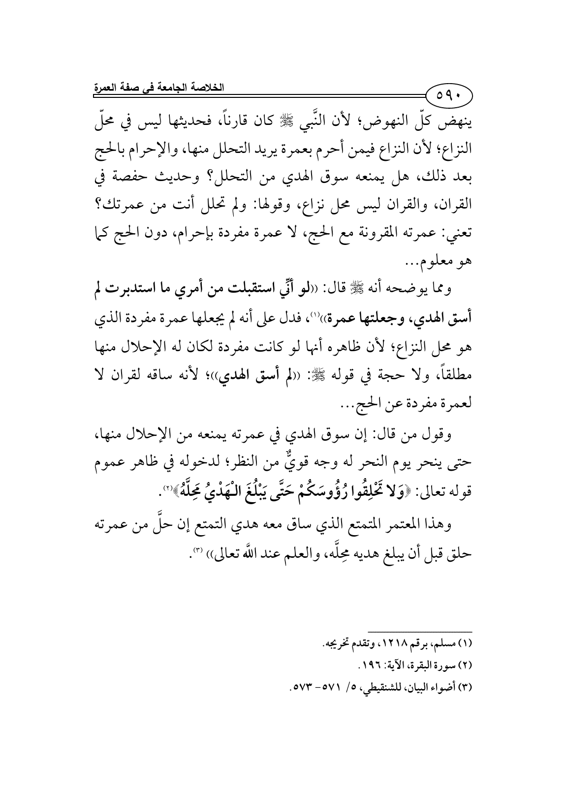 ومما يوضحه أنه - صلى الله عليه وسلم - قال: ((لو أنِّي استقبلت من أمري ما استدبرت لم أسق الهدي، وجعلتها عمرة)) (¬1)، فدل على أنه لم يجعلها عمرة مفردة الذي هو محل النزاع؛ لأن ظاهره أنها لو كانت مفردة لكان له الإحلال منها مطلقاً، ولا حجة في قوله - صلى الله عليه وسلم -: ((لم أسق الهدي))؛ لأنه ساقه لقران لا لعمرة مفردة عن الحج ...