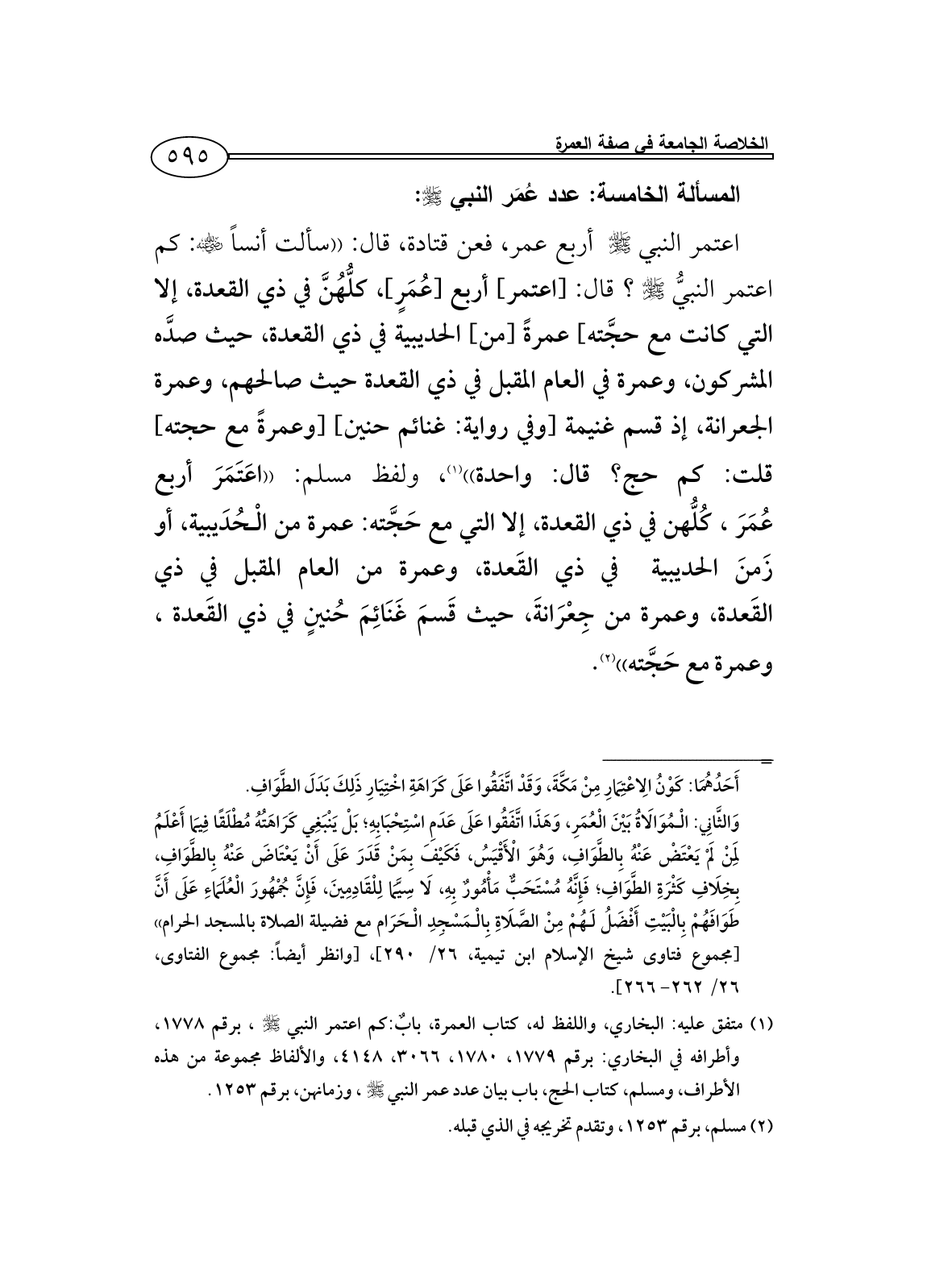 (¬1) متفق عليه: البخاري، واللفظ له، كتاب العمرة، بابٌ: كم اعتمر النبي - صلى الله عليه وسلم -، برقم 1778، وأطرافه في البخاري: برقم 1779، 1780، 3066، 4148، والألفاظ مجموعة من هذه الأطراف، ومسلم، كتاب الحج، باب بيان عدد عمر النبي - صلى الله عليه وسلم -، وزمانهن، برقم 1253.