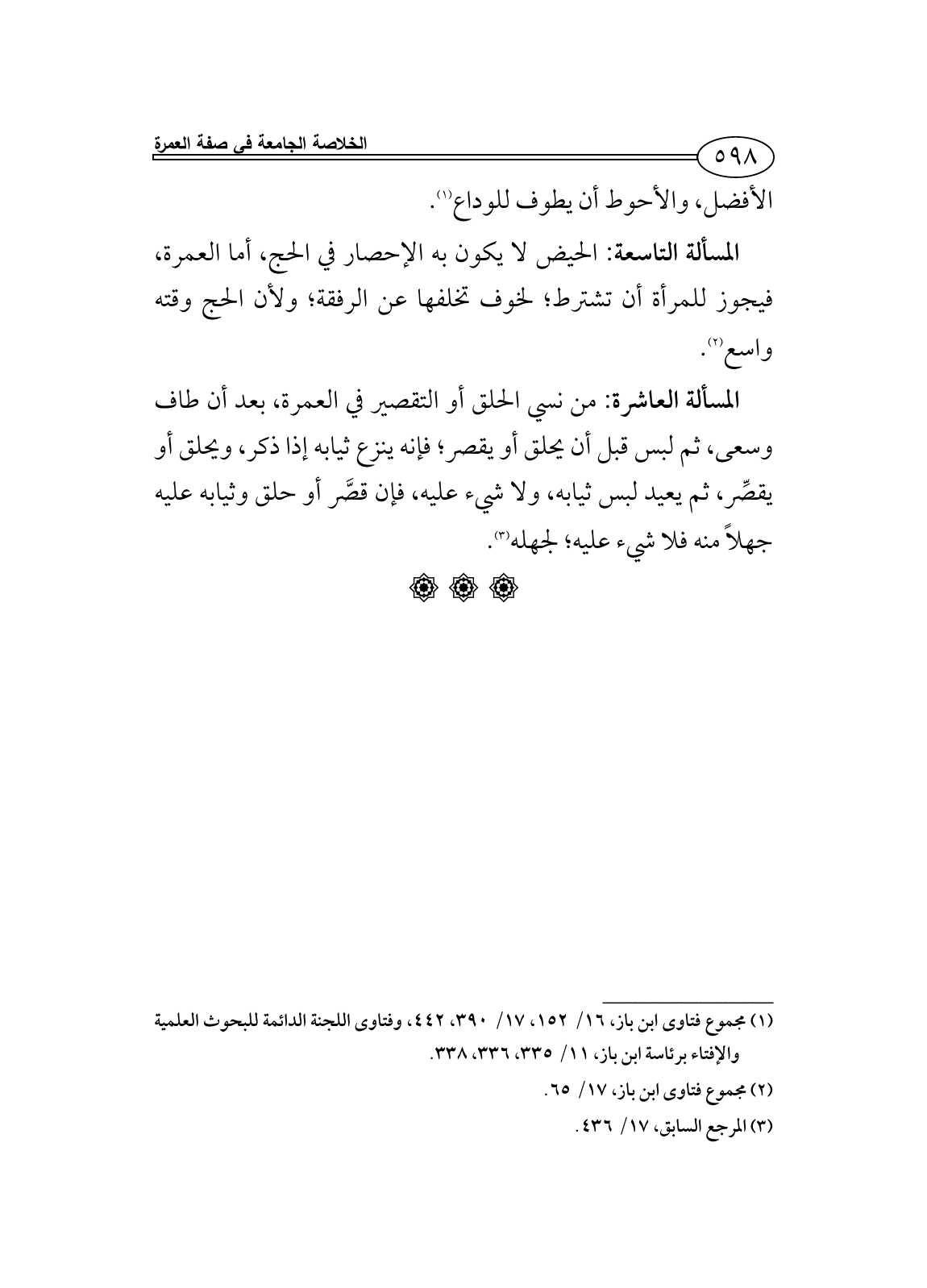 (¬1) مجموع فتاوى ابن باز، 16/ 152، 17/ 390، 442، وفتاوى اللجنة الدائمة للبحوث العلمية والإفتاء برئاسة ابن باز، 11/ 335، 336، 338.