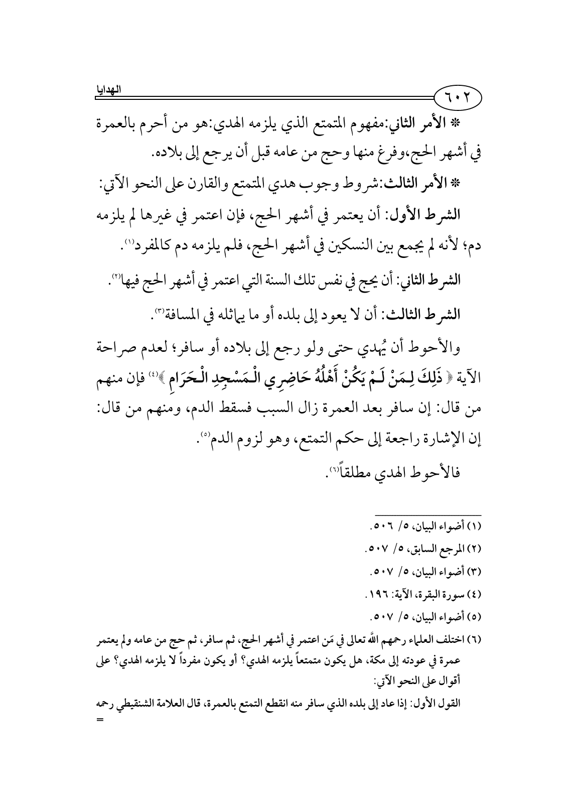 قال الشنقيطي رحمه اللَّه في أضواء البيان، 5/ 507: ((والأحوط عندي: إراقة دم التمتع، ولو سافر لعدم صراحة دلالة الآية، في إسقاطه؛ وللاحتمال الآخر الذي تمسك به البخاري والحنفية [يعني أن البخاري والحنفية يرون أن الإشارة في قوله تعالى: ((ذلك)) راجعة إلى نفس التمتع، وأن أهل مكة لا متعة لهم أصلاً، فلا دليل في الآية على أقوال الأئمة الأربعة.