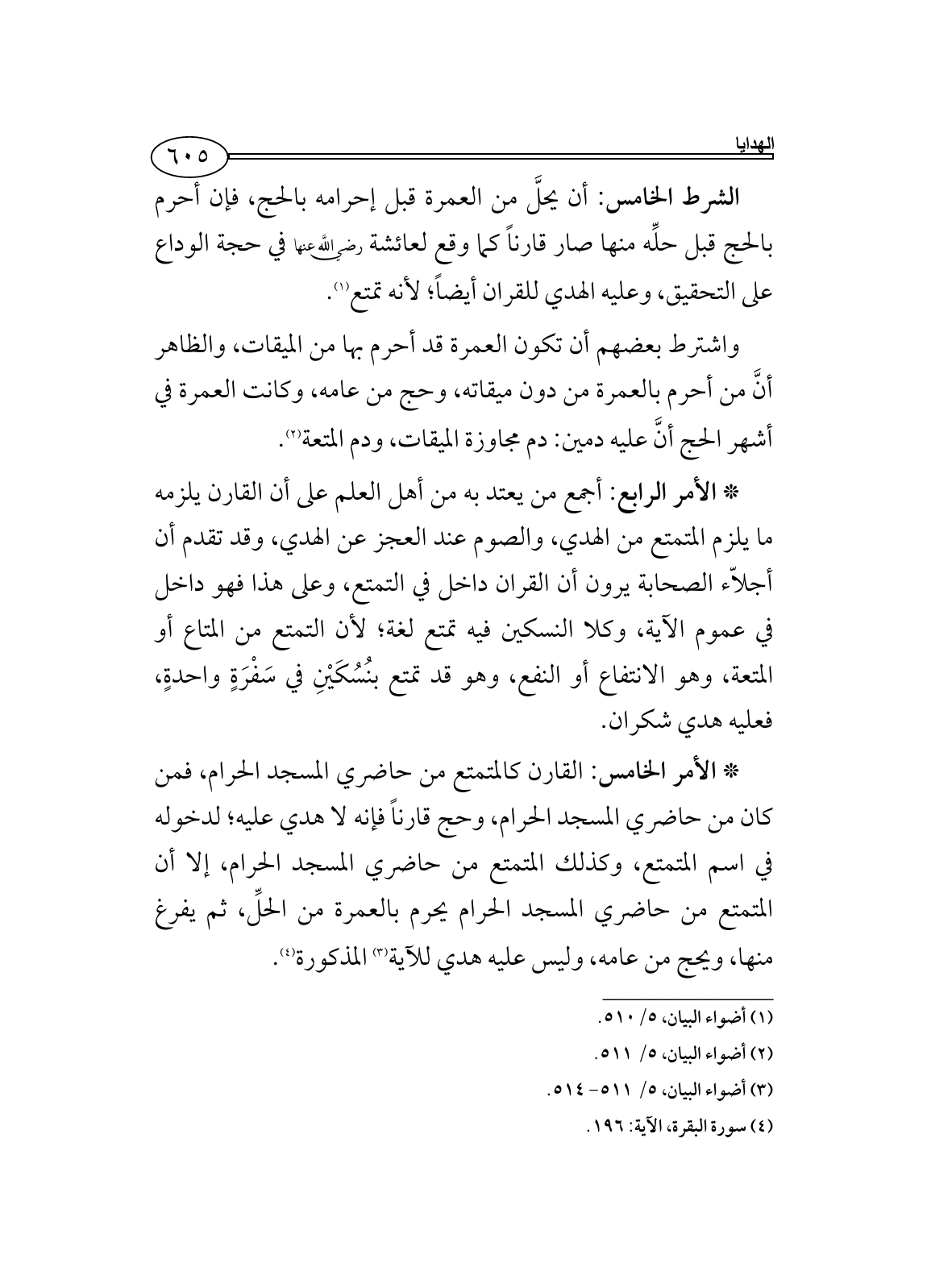 * الأمر الخامس: القارن كالمتمتع من حاضري المسجد الحرام، فمن كان من حاضري المسجد الحرام، وحج قارناً فإنه لا هدي عليه؛ لدخوله في اسم المتمتع، وكذلك المتمتع من حاضري المسجد الحرام، إلا أن المتمتع من حاضري المسجد الحرام يحرم بالعمرة من الحلِّ، ثم يفرغ منها، ويحج من عامه، وليس عليه هدي للآية (¬3) المذكورة (¬4).
