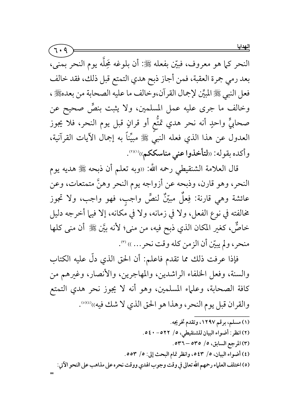 فإذا عرفت ذلك مما تقدم فاعلم: أن الحق الذي دلّ عليه الكتاب والسنة، وفعل الخلفاء الراشدين، والمهاجرين، والأنصار، وغيرهم من كافة الصحابة، وعلماء المسلمين، وهو أنه لا يجوز نحر هدي التمتع والقران قبل يوم النحر، وهذا هو الحق الذي لا شك فيه)) (¬4) (¬5).