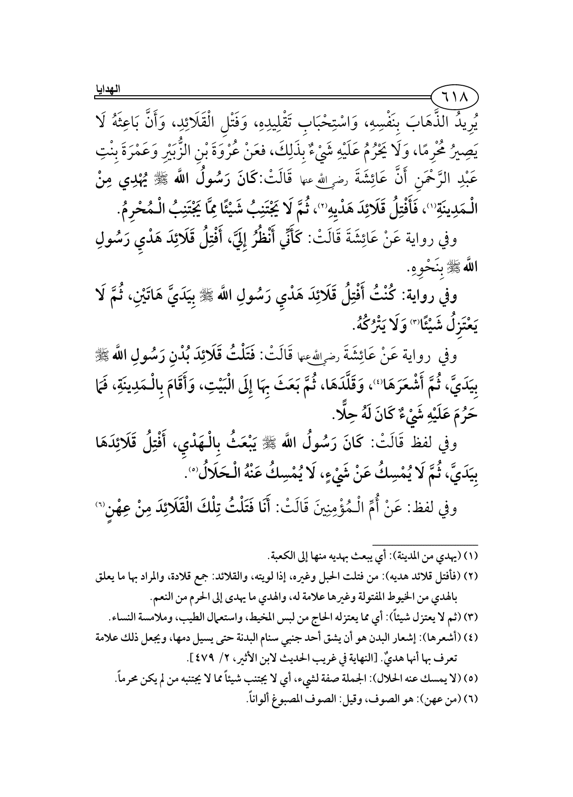وفي لفظ قَالَتْ: كَانَ رَسُولُ اللَّه - صلى الله عليه وسلم - يَبْعَثُ بِالْهَدْيِ، أَفْتِلُ قَلَائِدَهَا بِيَدَيَّ، ثُمَّ لَا يُمْسِكُ عَنْ شَيْءٍ، لَا يُمْسِكُ عَنْهُ الْحَلَالُ (¬5).