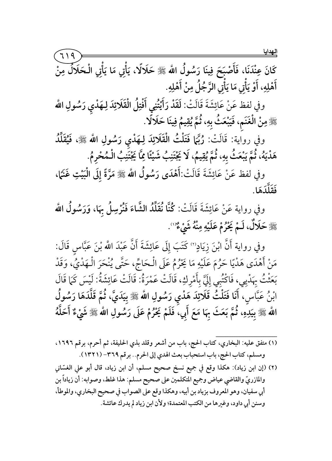 وفي رواية عَنْ عَائِشَةَ قَالَتْ: كُنَّا نُقَلِّدُ الشَّاءَ فَنُرْسِلُ بِهَا، وَرَسُولُ اللَّه - صلى الله عليه وسلم - حَلَالٌ، لَمْ يَحْرُمْ عَلَيْهِ مِنْهُ شَيْءٌ (¬1).