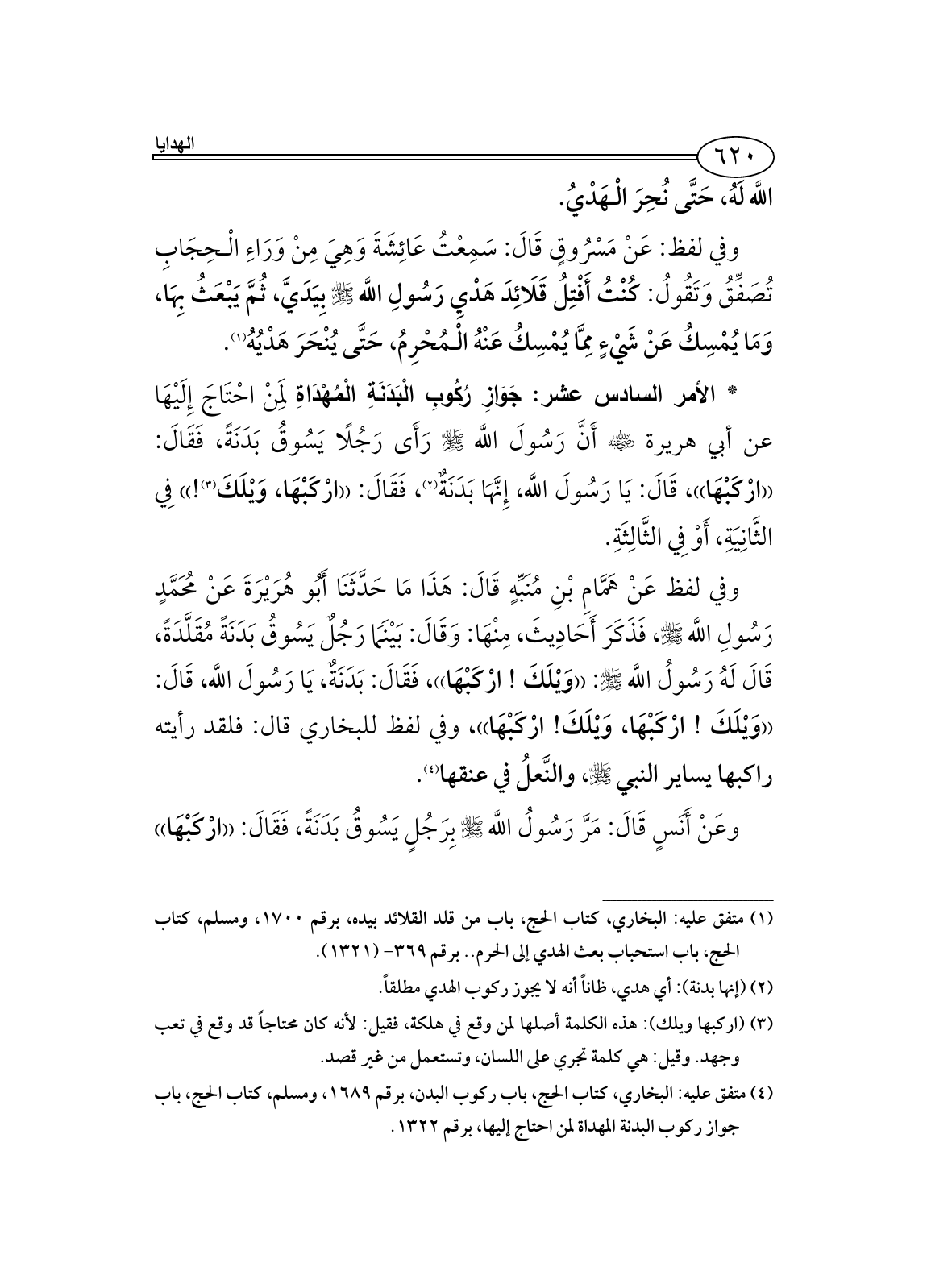 * الأمر السادس عشر: جَوَازِ رُكُوبِ الْبَدَنَةِ الْمُهْدَاةِ لِمَنْ احْتَاجَ إِلَيْهَا عن أبي هريرة - رضي الله عنه - أَنَّ رَسُولَ اللَّه - صلى الله عليه وسلم - رَأَى رَجُلًا يَسُوقُ بَدَنَةً، فَقَالَ: ((ارْكَبْهَا))، قَالَ: يَا رَسُولَ اللَّه، إِنَّهَا بَدَنَةٌ (¬2)، فَقَالَ: ((ارْكَبْهَا، وَيْلَكَ (¬3)!)) فِي الثَّانِيَةِ، أَوْ فِي الثَّالِثَةِ.
