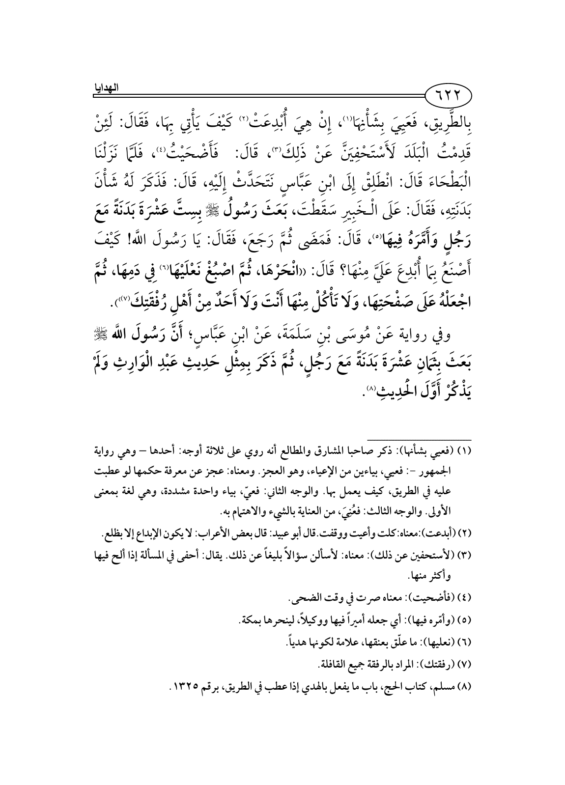 قَدِمْتُ الْبَلَدَ لَأَسْتَحْفِيَنَّ عَنْ ذَلِكَ (¬3)، قَالَ: فَأَضْحَيْتُ (¬4)، فَلَمَّا نَزَلْنَا الْبَطْحَاءَ قَالَ: انْطَلِقْ إِلَى ابْنِ عَبَّاسٍ نَتَحَدَّثْ إِلَيْهِ، قَالَ: فَذَكَرَ لَهُ شَأْنَ بَدَنَتِهِ، فَقَالَ: عَلَى الْخَبِيرِ سَقَطْتَ، بَعَثَ رَسُولُ - صلى الله عليه وسلم - بِسِتَّ عَشْرَةَ بَدَنَةً مَعَ رَجُلٍ وَأَمَّرَهُ فِيهَا (¬5)، قَالَ: فَمَضَى ثُمَّ رَجَعَ، فَقَالَ: يَا رَسُولَ اللَّه! كَيْفَ أَصْنَعُ بِمَا أُبْدِعَ عَلَيَّ مِنْهَا؟ قَالَ: ((انْحَرْهَا، ثُمَّ اصْبُغْ نَعْلَيْهَا (¬6) فِي دَمِهَا، ثُمَّ اجْعَلْهُ عَلَى صَفْحَتِهَا، وَلَا تَأْكُلْ مِنْهَا أَنْتَ وَلَا أَحَدٌ مِنْ أَهْلِ رُفْقَتِكَ (¬7))).