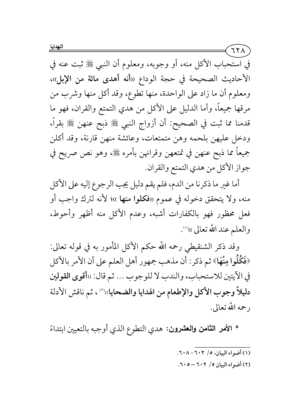 {فَكُلُوا مِنْهَا} ثم ذكر: أن مذهب جمهور أهل العلم على أن الأمر بالأكل في الآيتين للاستحباب، والندب لا للوجوب ... ثم قال: ((أقوى القولين دليلاً وجوب الأكل والإطعام من الهدايا والضحايا)) (¬2)، ثم ناقش الأدلة رحمه اللَّه تعالى.