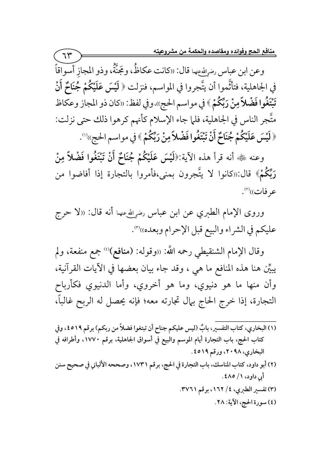 (¬1) البخاري، كتاب التفسير، بابٌ (ليس عليكم جناح أن تبتغوا فضلاً من ربكم) برقم 4519، وفي كتاب الحج، باب التجارة أيام الموسم والبيع في أسواق الجاهلية، برقم 1770، وأطرافه في البخاري، 2098، ورقم 4519.