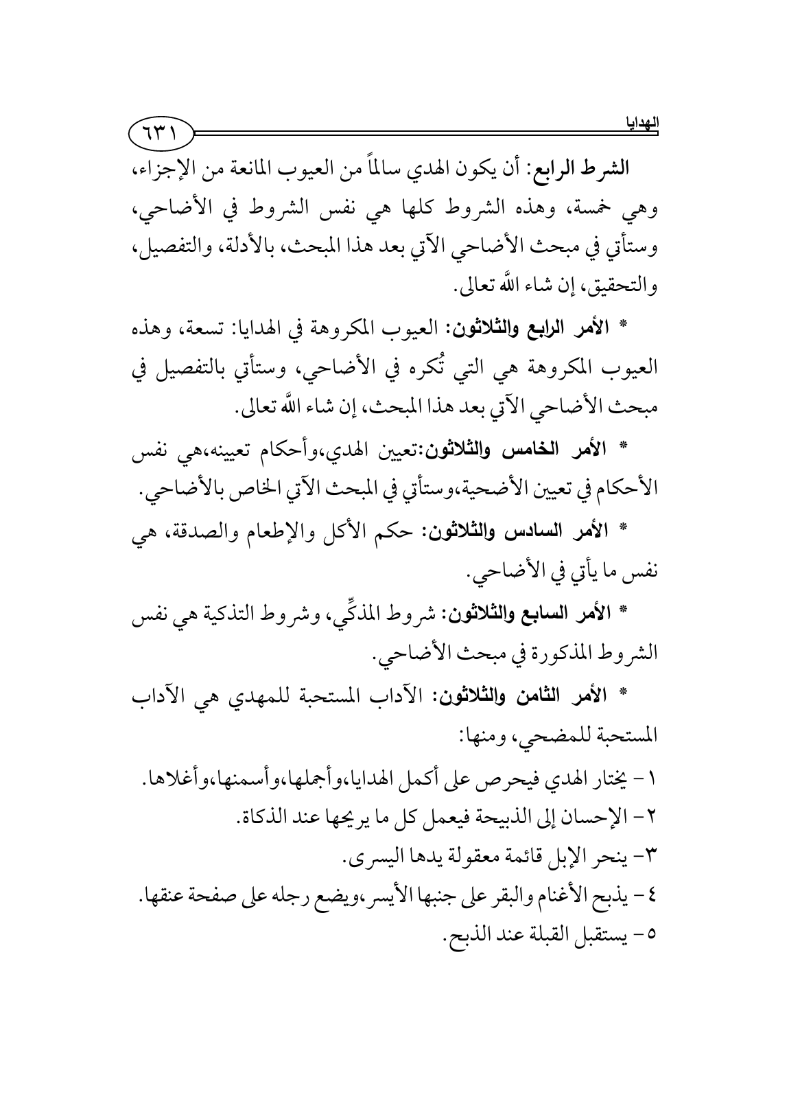 * الأمر الرابع والثلاثون: العيوب المكروهة في الهدايا: تسعة، وهذه العيوب المكروهة هي التي تُكره في الأضاحي، وستأتي بالتفصيل في مبحث الأضاحي الآتي بعد هذا المبحث، إن شاء اللَّه تعالى.