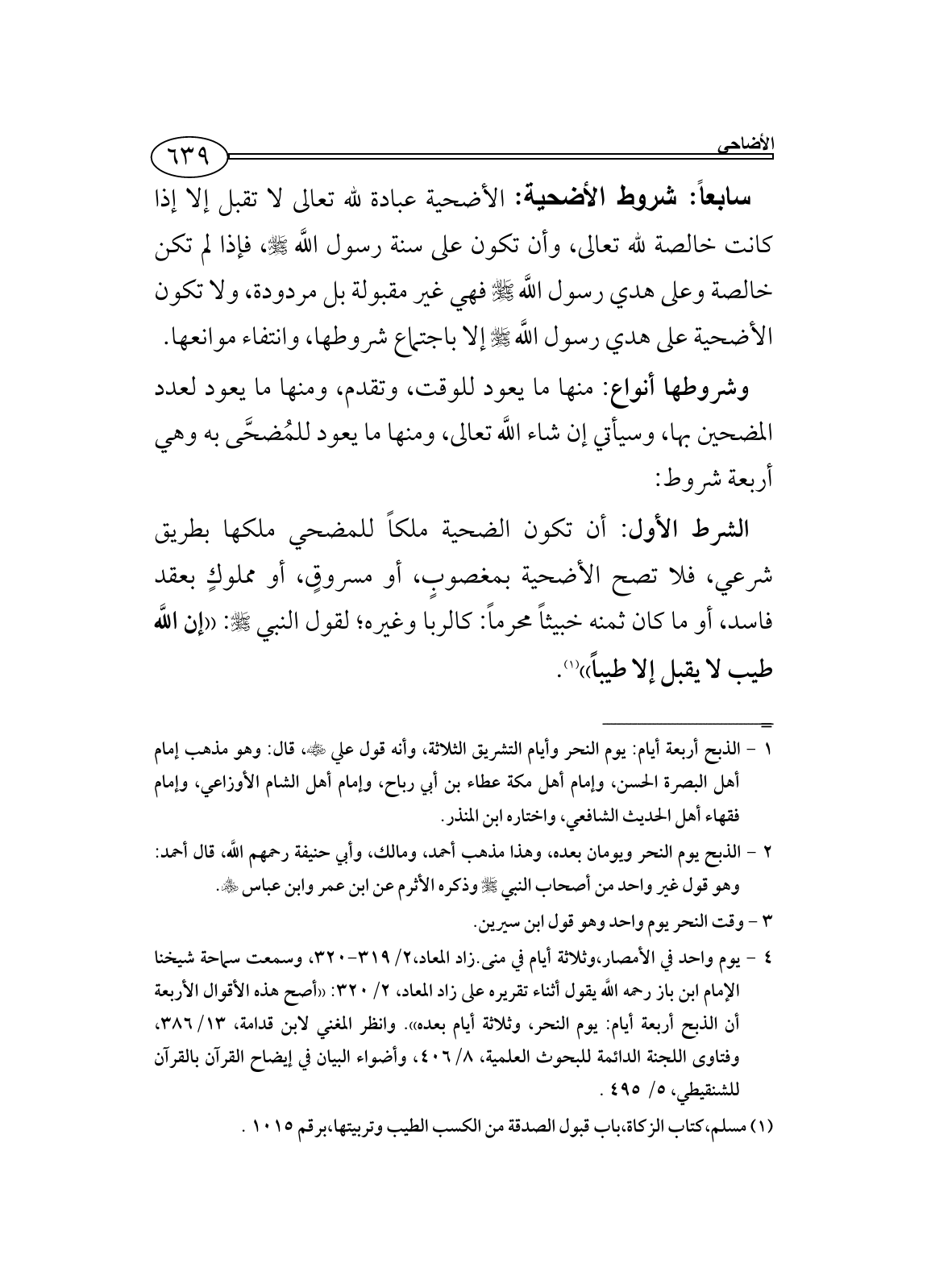 سابعاً: شروط الأضحية: الأضحية عبادة لله تعالى لا تقبل إلا إذا كانت خالصة لله تعالى، وأن تكون على سنة رسول اللَّه - صلى الله عليه وسلم -، فإذا لم تكن خالصة وعلى هدي رسول اللَّه - صلى الله عليه وسلم - فهي غير مقبولة بل مردودة، ولا تكون الأضحية على هدي رسول اللَّه - صلى الله عليه وسلم - إلا باجتماع شروطها، وانتفاء موانعها.