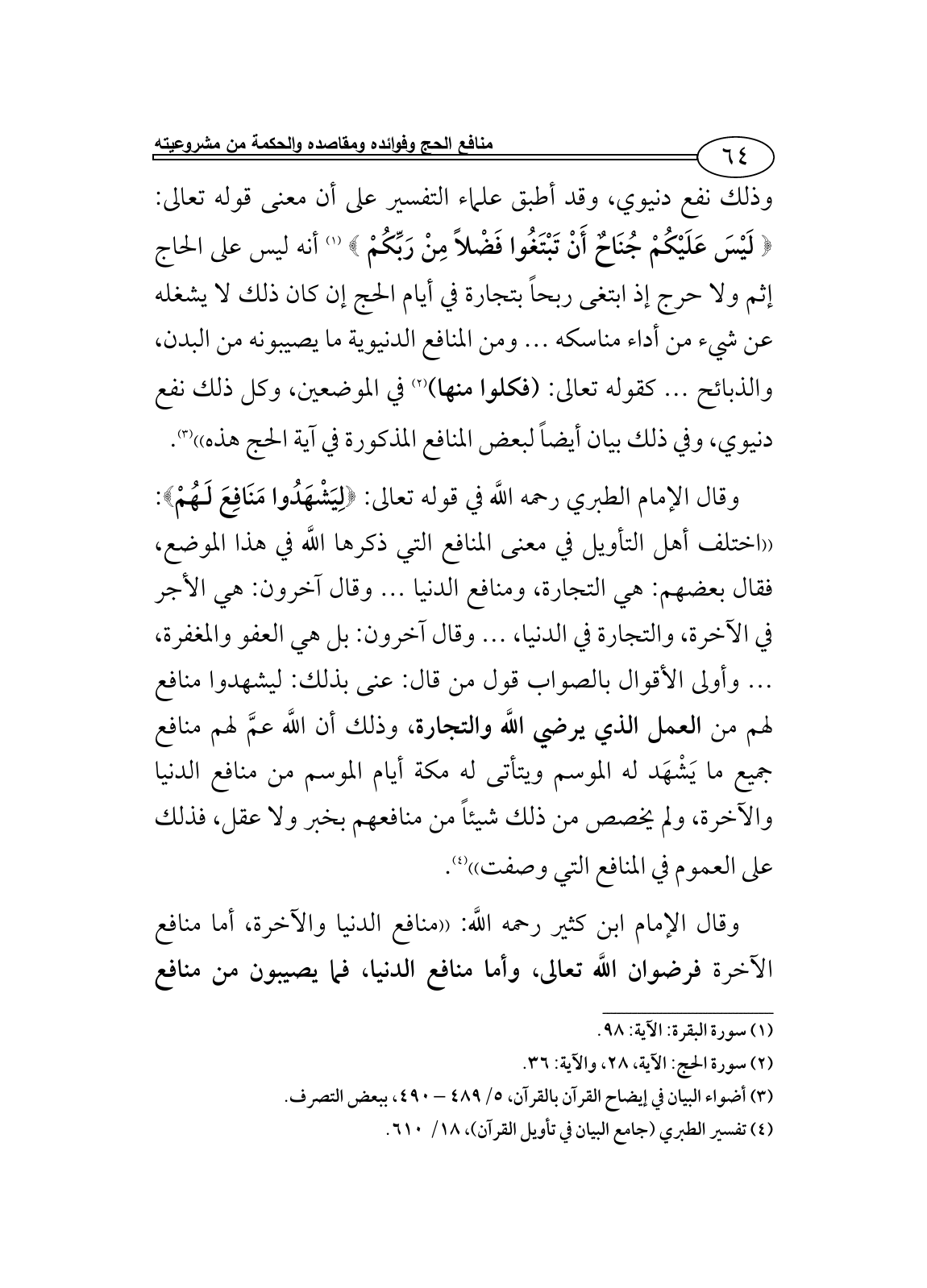 وقال الإمام الطبري رحمه اللَّه في قوله تعالى: {لِيَشْهَدُوا مَنَافِعَ لَهُمْ}: ((اختلف أهل التأويل في معنى المنافع التي ذكرها اللَّه في هذا الموضع، فقال بعضهم: هي التجارة، ومنافع الدنيا ... وقال آخرون: هي الأجر في الآخرة، والتجارة في الدنيا، ... وقال آخرون: بل هي العفو والمغفرة، ... وأولى الأقوال بالصواب قول من قال: عنى بذلك: ليشهدوا منافع لهم من العمل الذي يرضي اللَّه والتجارة، وذلك أن اللَّه عمَّ لهم منافع جميع ما يَشْهَد له الموسم ويتأتى له مكة أيام الموسم من منافع الدنيا والآخرة، ولم يخصص من ذلك شيئاً من منافعهم بخبر ولا عقل، فذلك على العموم في المنافع التي وصفت)) (¬4).