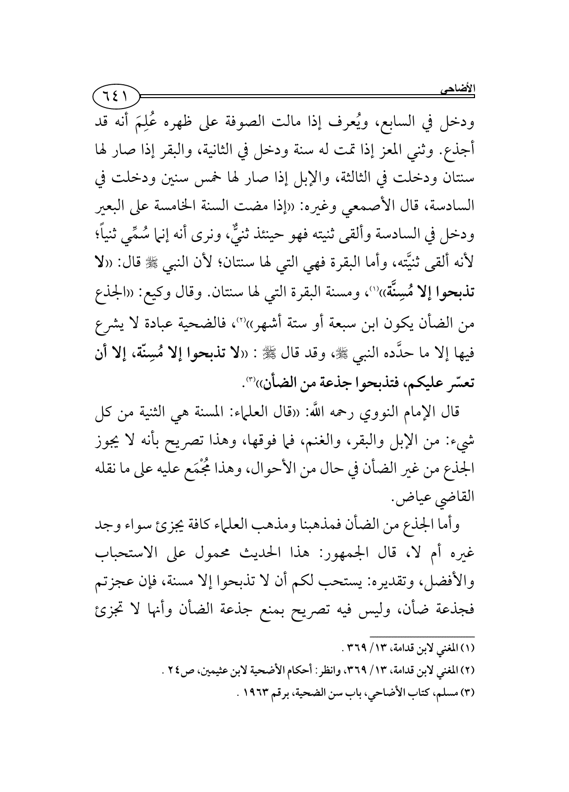 ودخل في السابع، ويُعرف إذا مالت الصوفة على ظهره عُلِمَ أنه قد أجذع. وثني المعز إذا تمت له سنة ودخل في الثانية، والبقر إذا صار لها سنتان ودخلت في الثالثة، والإبل إذا صار لها خمس سنين ودخلت في السادسة، قال الأصمعي وغيره: ((إذا مضت السنة الخامسة على البعير ودخل في السادسة وألقى ثنيته فهو حينئذ ثنيٌّ، ونرى أنه إنما سُمِّي ثنياً؛ لأنه ألقى ثنيَّته، وأما البقرة فهي التي لها سنتان؛ لأن النبي - صلى الله عليه وسلم - قال: ((لا تذبحوا إلا مُسِنَّة)) (¬1)، ومسنة البقرة التي لها سنتان. وقال وكيع: ((الجذع من الضأن يكون ابن سبعة أو ستة أشهر)) (¬2)، فالضحية عبادة لا يشرع فيها إلا ما حدَّده النبي - صلى الله عليه وسلم -، وقد قال - صلى الله عليه وسلم -: ((لا تذبحوا إلا مُسِنّة، إلا أن تعسّر عليكم، فتذبحوا جذعة من الضأن)) (¬3).