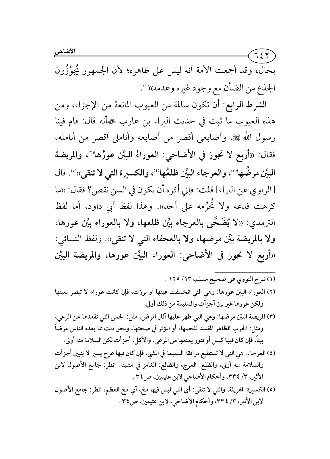 الشرط الرابع: أن تكون سالمة من العيوب المانعة من الإجزاء، ومن هذه العيوب ما ثبت في حديث البراء بن عازب - رضي الله عنه - أنه قال: قام فينا رسول اللَّه - صلى الله عليه وسلم -، وأصابعي أقصر من أصابعه وأناملي أقصر من أنامله، فقال: ((أربع لا تجوز في الأضاحي: العوراءُ البيِّن عورُها (¬2)، والمريضة البيِّن مرضُها (¬3)، والعرجاء البيِّن ظلعُها (¬4)، والكسيرة التي لا تنقى)) (¬5). قال