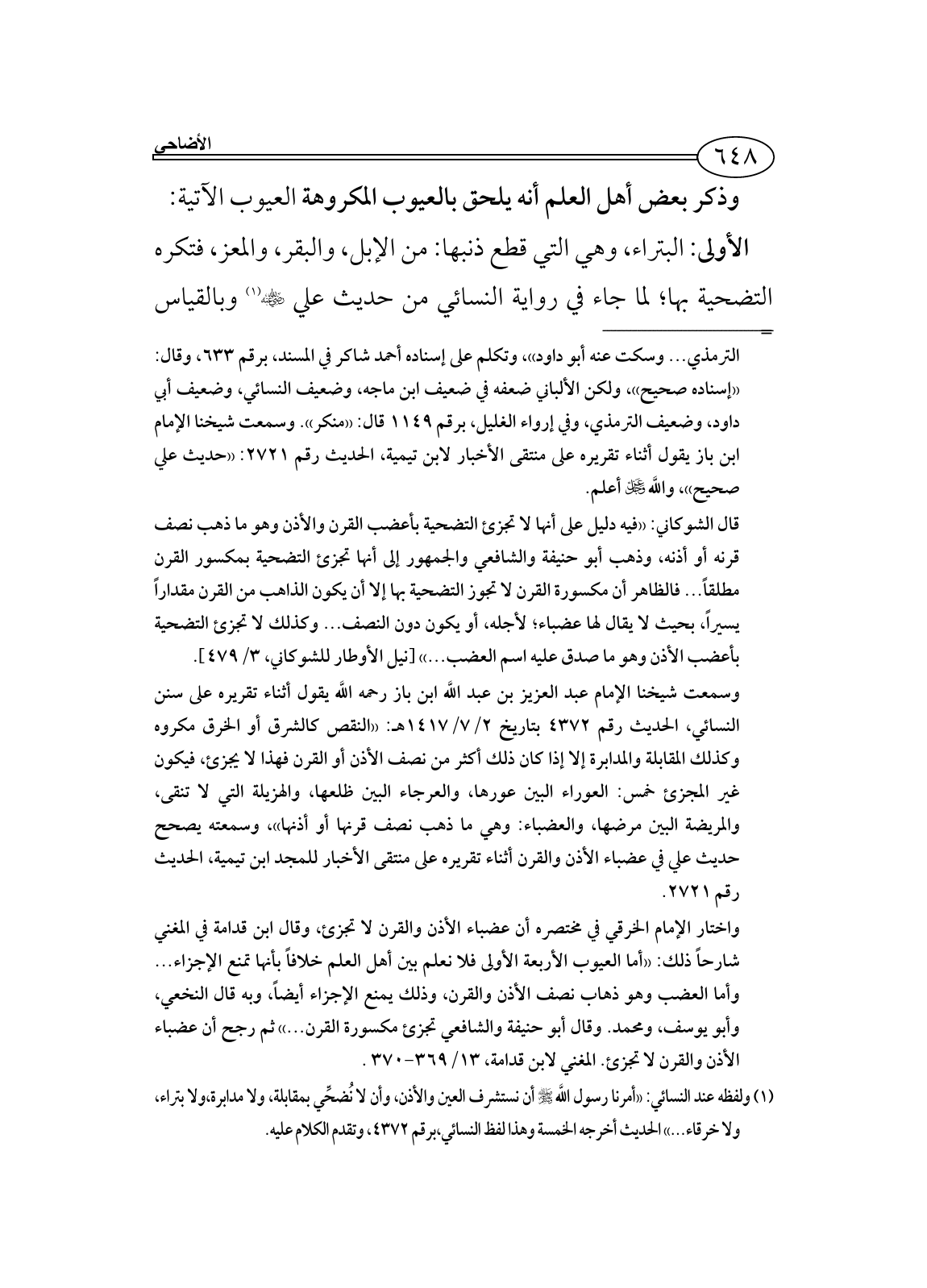 (¬1) ولفظه عند النسائي: ((أمرنا رسول اللَّه - صلى الله عليه وسلم - أن نستشرف العين والأذن، وأن لا نُضحِّي بمقابلة، ولا مدابرة، ولا بتراء، ولا خرقاء ... )) الحديث أخرجه الخمسة وهذا لفظ النسائي، برقم 4372، وتقدم الكلام عليه.