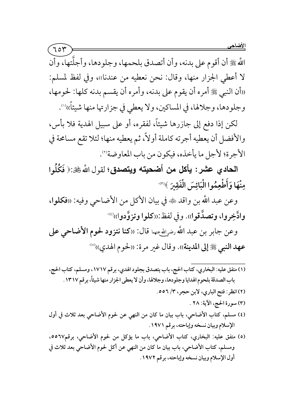 (¬5) متفق عليه: البخاري، كتاب الأضاحي، باب ما يؤكل من لحوم الأضاحي، برقم5567، ومسلم، كتاب الأضاحي، باب بيان ما كان من النهي عن أكل لحوم الأضاحي بعد ثلاث في أول الإسلام وبيان نسخه وإباحته، برقم 1972.
