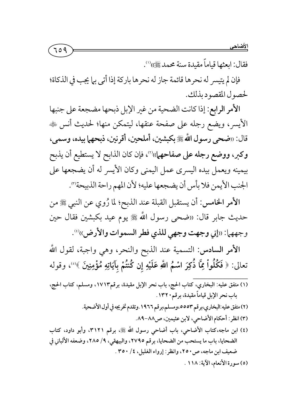 الأمر الرابع: إذا كانت الضحية من غير الإبل ذبحها مضجعة على جنبها الأيسر، ويضع رجله على صفحة عنقها، ليتمكن منها؛ لحديث أنس - رضي الله عنه -