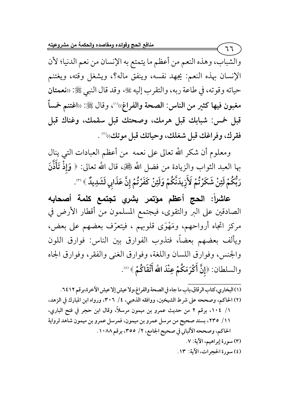والشباب، وهذه النعم من أعظم ما يتمتع به الإنسان من نعم الدنيا؛ لأن الإنسان بهذه النعم: يجهد نفسه، وينفق ماله؟، ويشغل وقته، ويغتنم حياته وقوته، في طاعة ربه، والتقرب إليه - سبحانه وتعالى -، وقد قال النبي - صلى الله عليه وسلم -: ((نعمتان